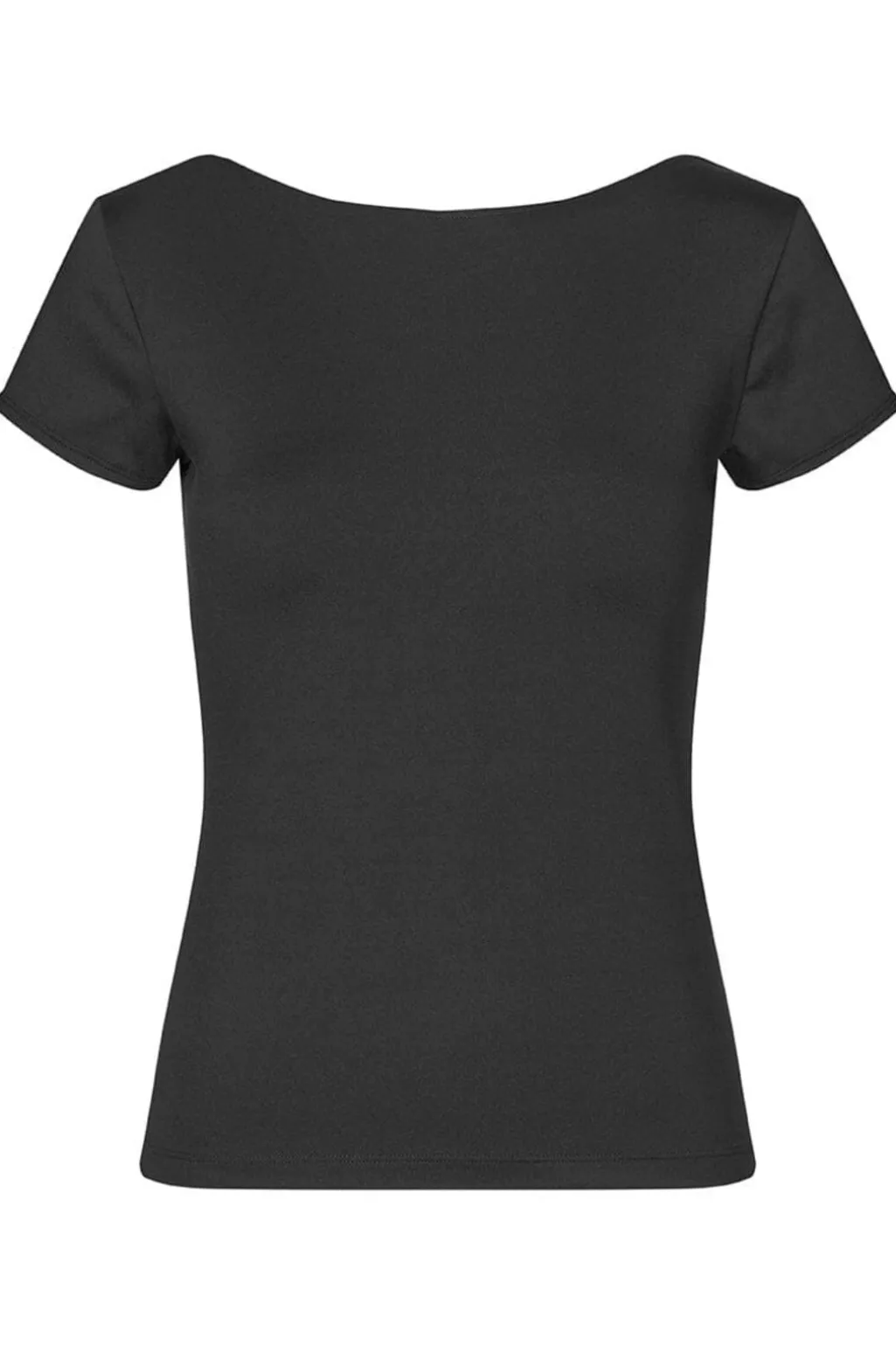 Sort t-shirt fra Modström med korte ærmer og tætsiddende silhuet. T-shirten har en rund halsudskæring foran og en dyb udskæring i ryggen.