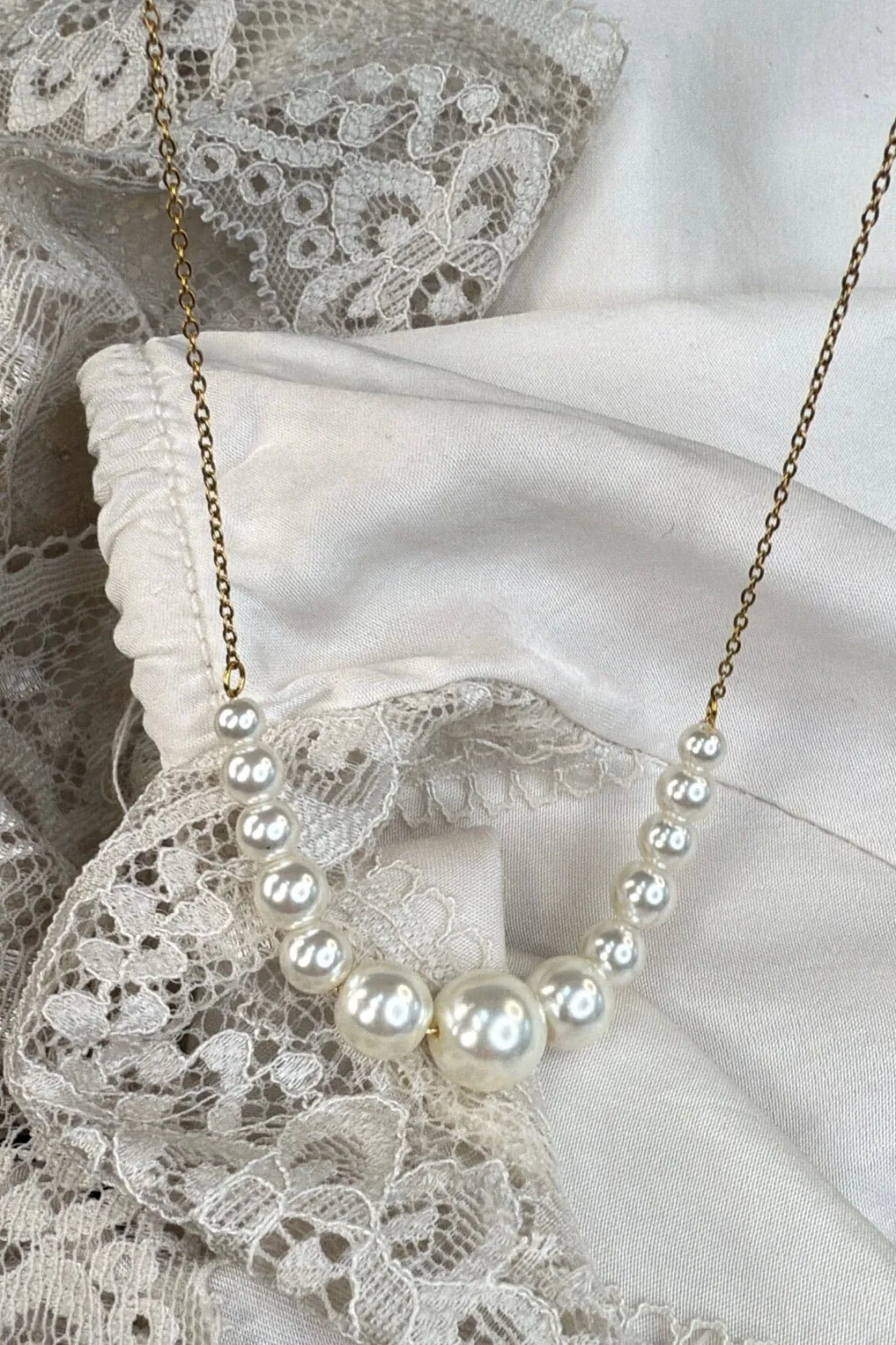 Halskæde fra Molly&My Jewellery med graduerede imiterede perler på en tynd, gylden kæde. Perlerne varierer i størrelse fra små til store.