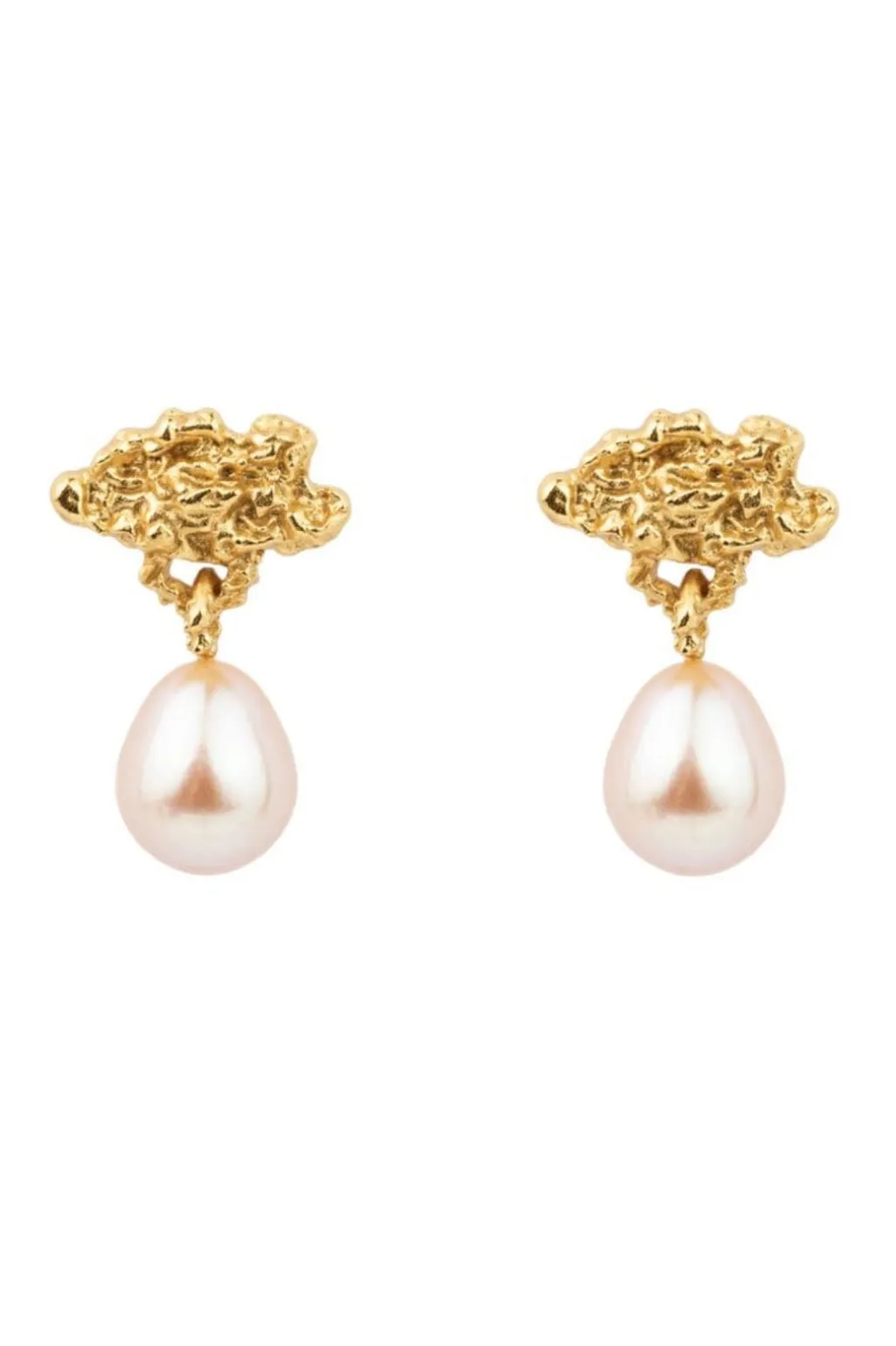 Forgyldte øreringe fra House Of Vincent med en organisk skyform i toppen og en dråbeformet perle. Den teksturerede overflade skaber et unikt udtryk.