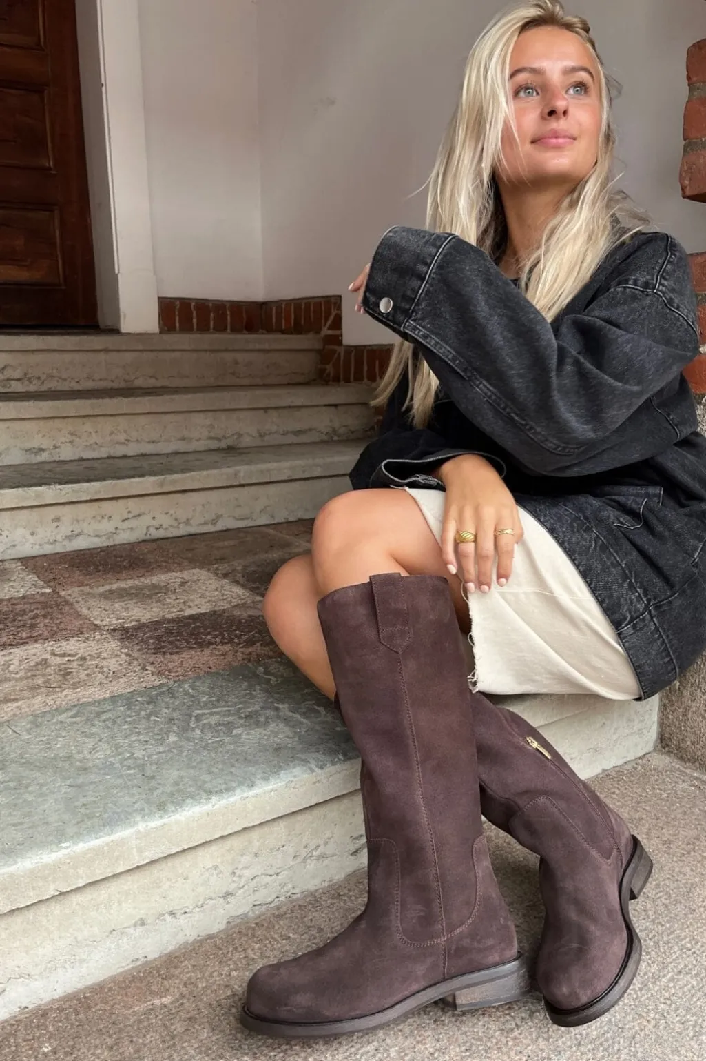 Knæhøj støvle i brun ruskind med rund tå. Støvlen har en lav blokhæl og lynlås i siden. Den brune nuance giver støvlen et rustikt udtryk.