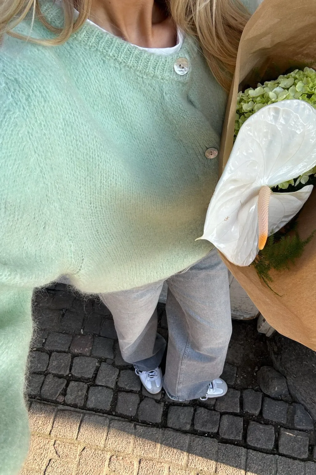 Mintfarvet cardigan fra BYIC med rund hals og perleknapper. Strikken har en blød og luftig struktur med lange, voluminøse ærmer, der giver den karakter.