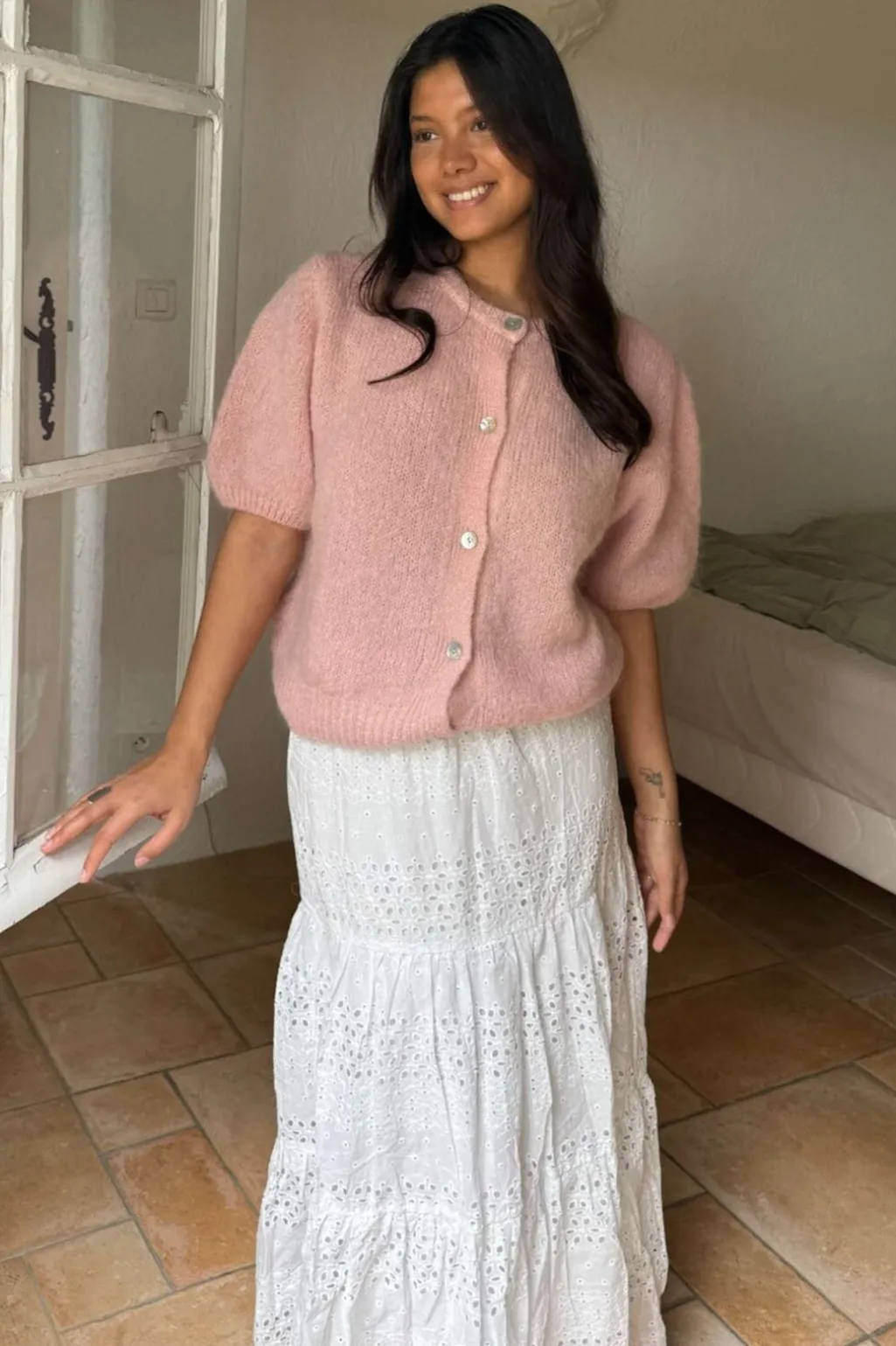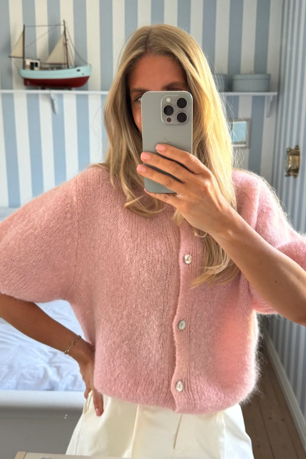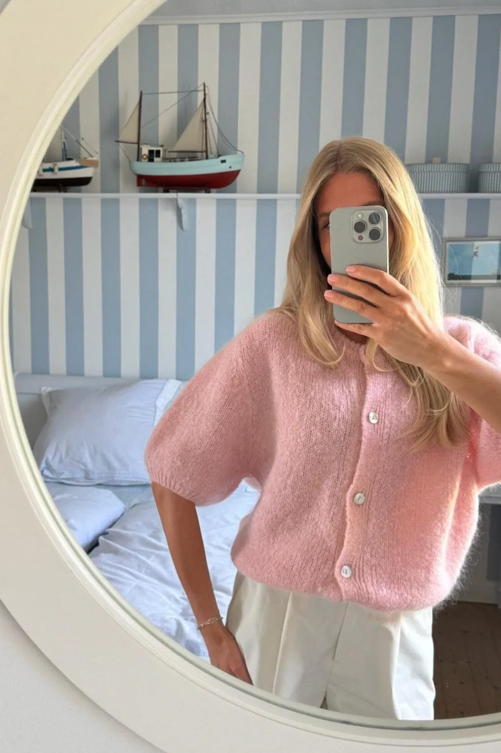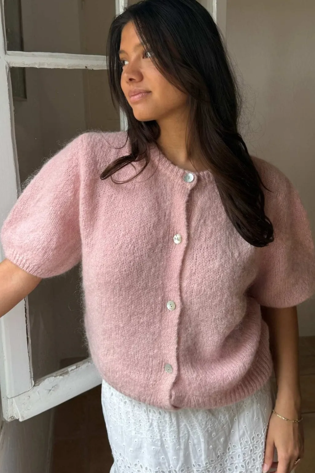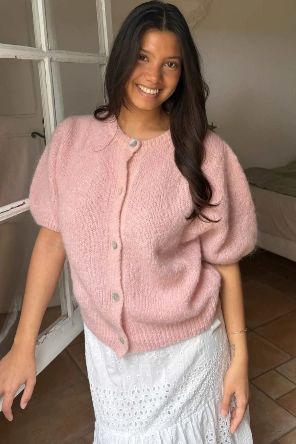 Fuzzy mohair cardigan med lange, voluminøse korte ærmer, ribdetaljer og perlemorslook på knapperne. True to size.