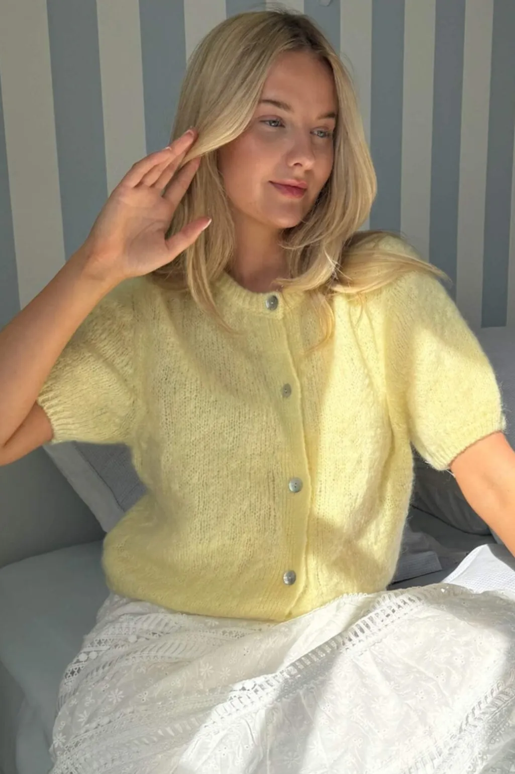 Onesize mohair cardigan med lange, voluminøse korte ærmer, ribdetaljer og knapper med perlemorslook. Normal i størrelsen.