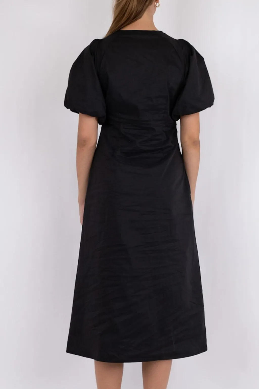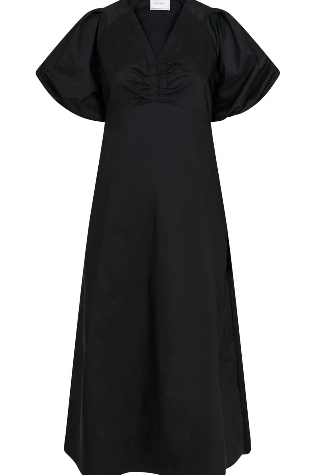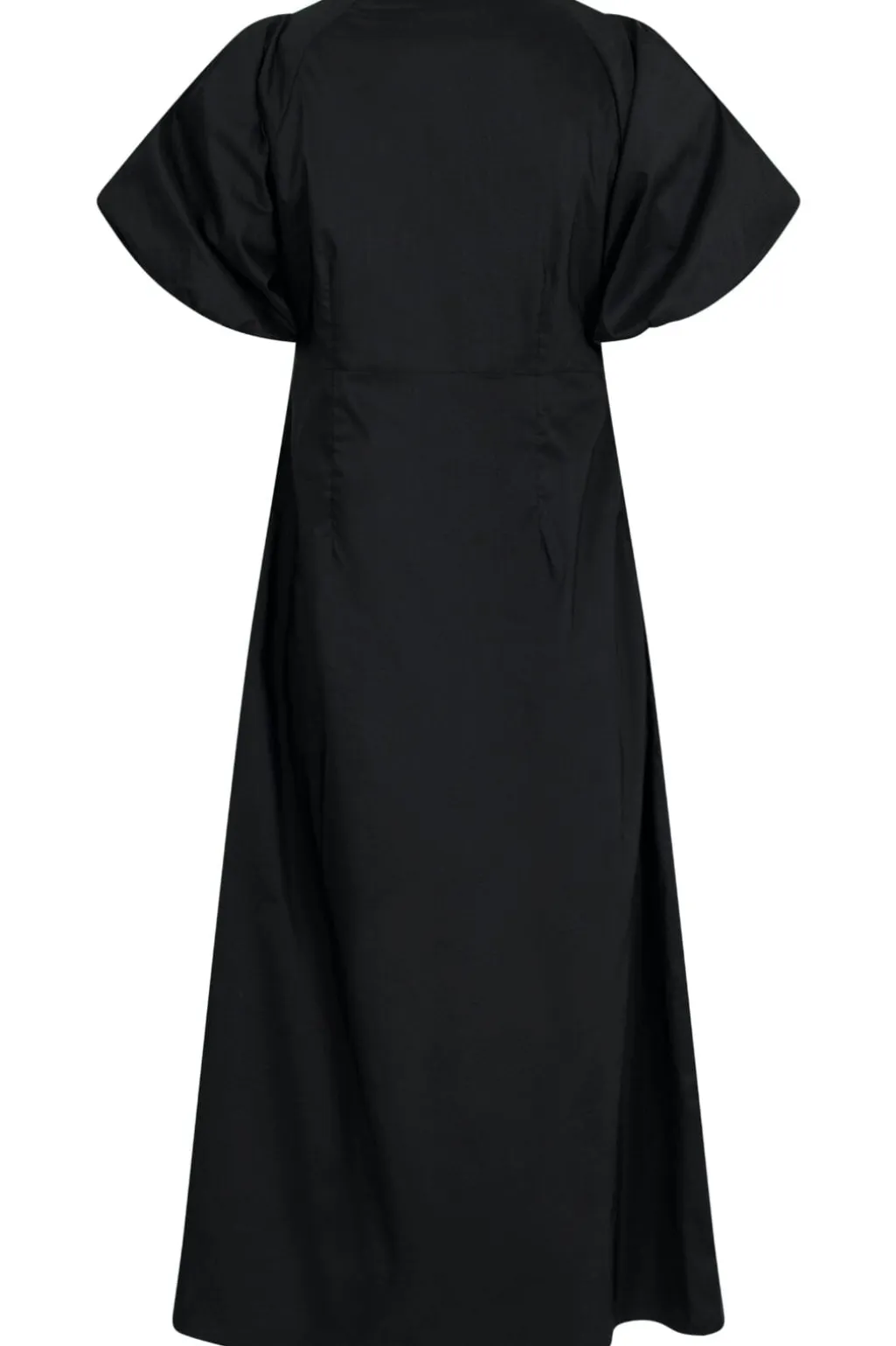 Sort poplinkjole fra Neo Noir med flæser og pufærmer. Kjolen har V-udskæring og går til midt på læggen. Praktiske lommer i siderne gør den anvendelig i hverdagen.