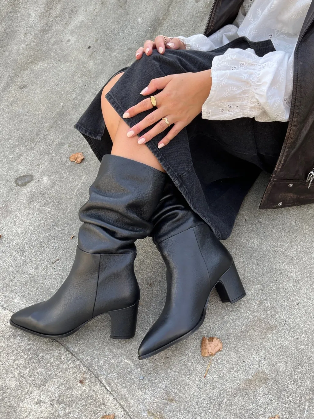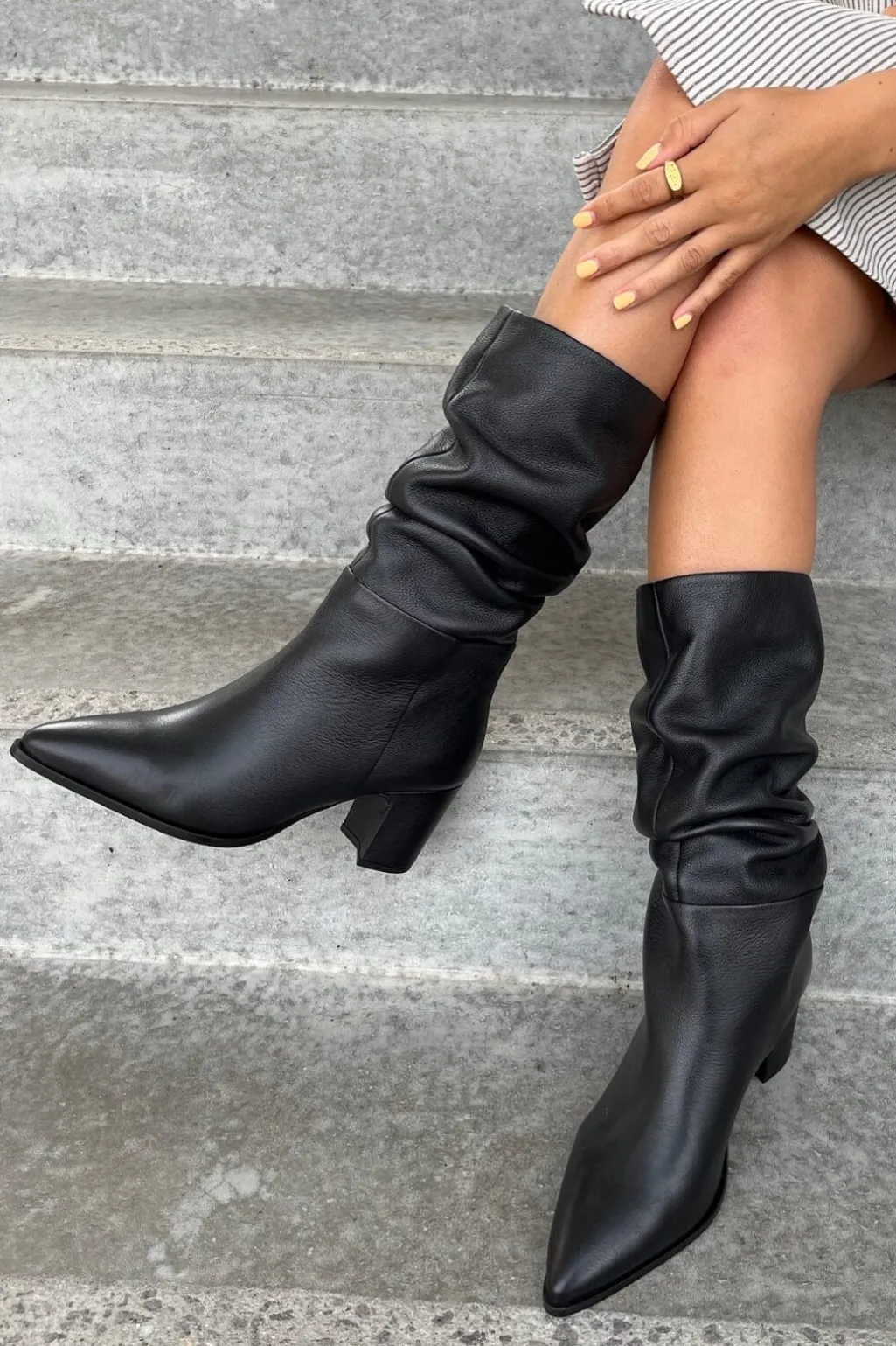 Sorte støvler i læder med krøllet skaft og spids tå. Indersålen har 4-6 mm Copenhagen Shoes-skum, og støvlen står på en 5-8 cm blokhæl.