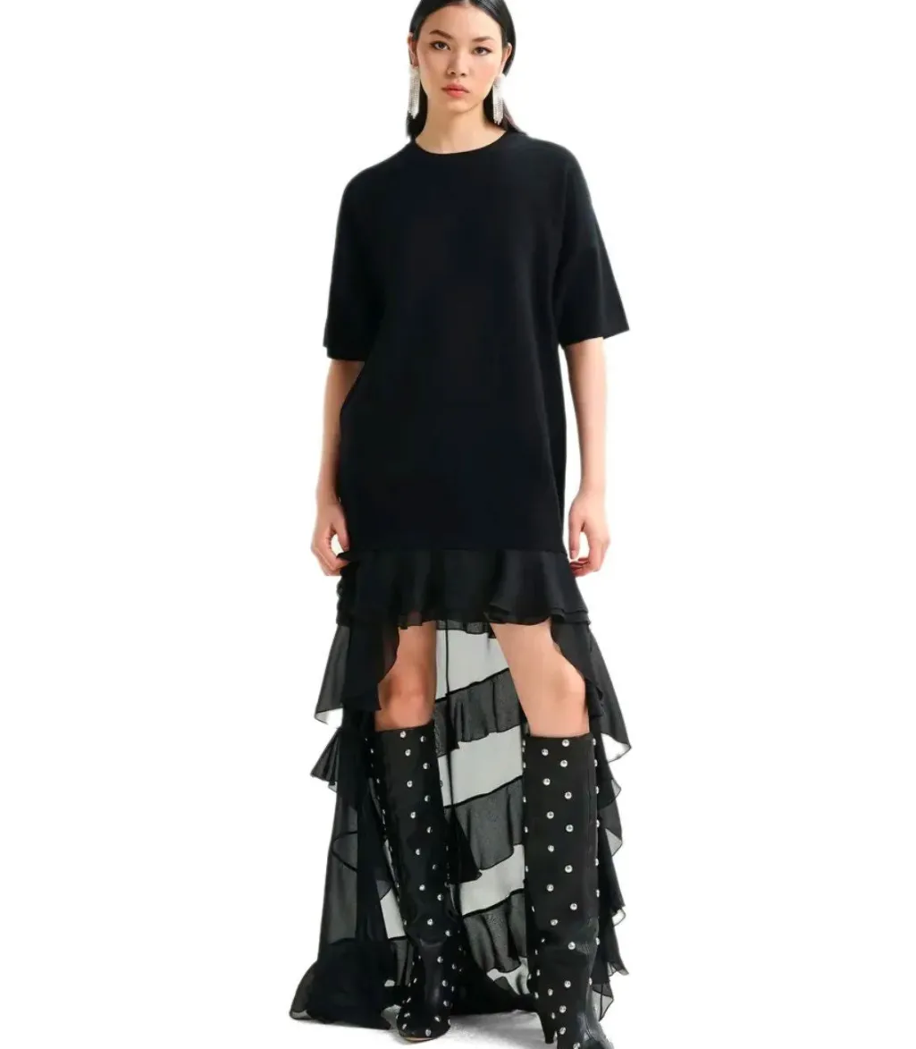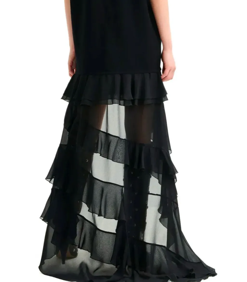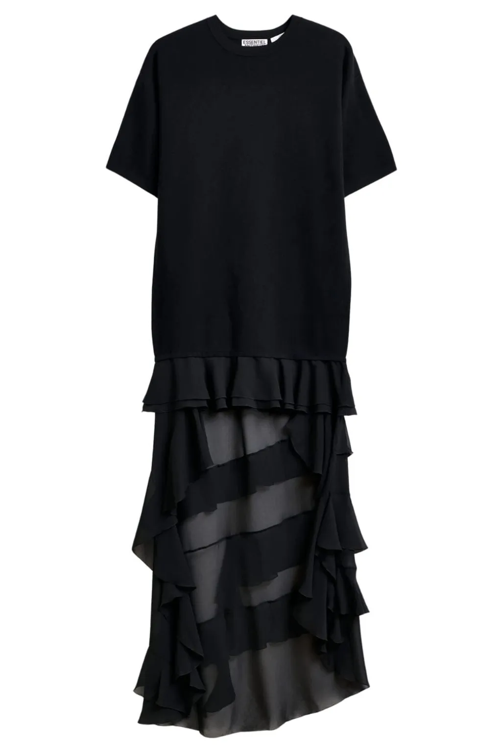 Sort strikkjole fra Essentiel Antwerp, velegnet til bryllupper, formelle begivenheder og fejringer. Kjolen har en løs pasform og går til anklerne.