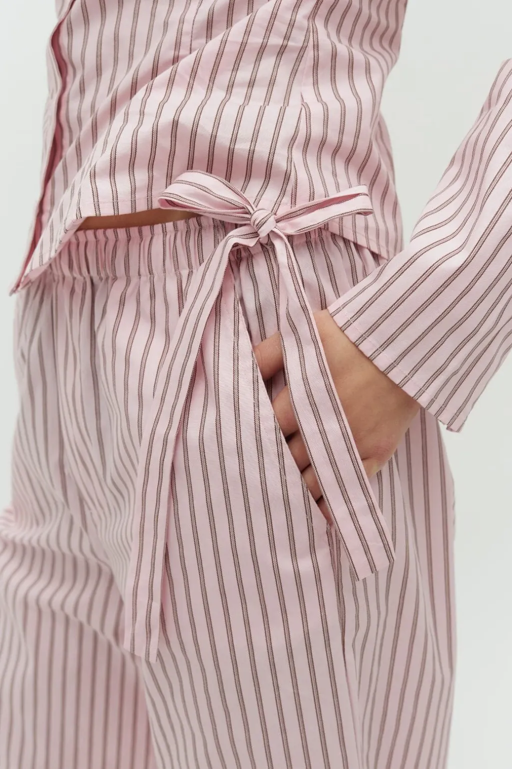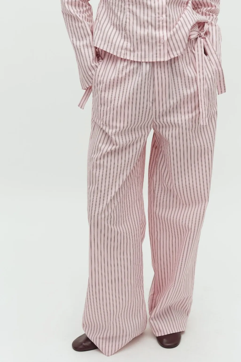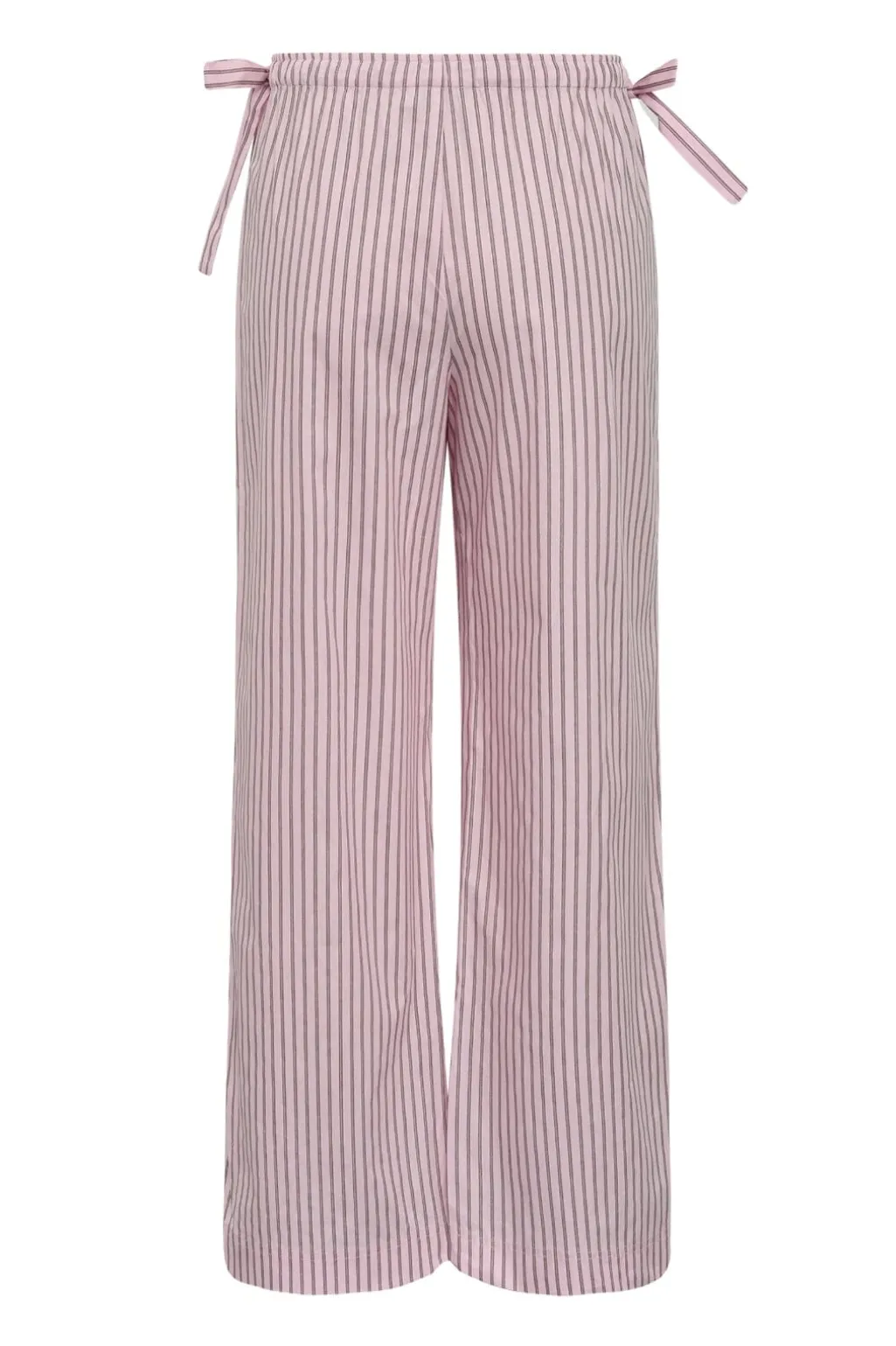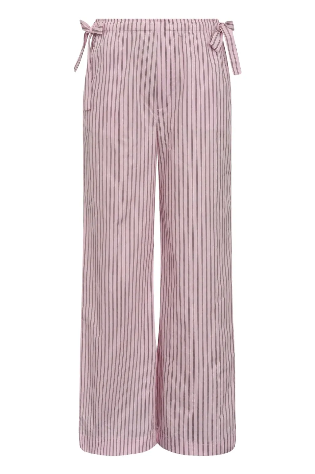 Stribede bukser fra MbyM i lyserød nuance med høj talje. Bukserne har vertikale striber og sløjfedetaljer i siderne samt en gulvlang længde.