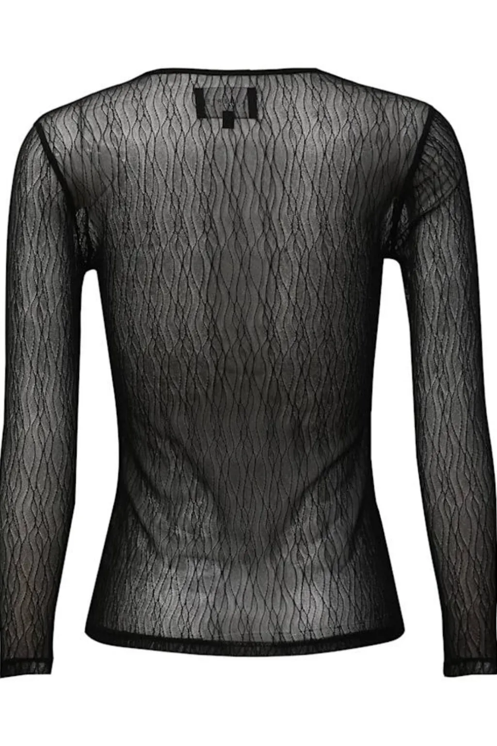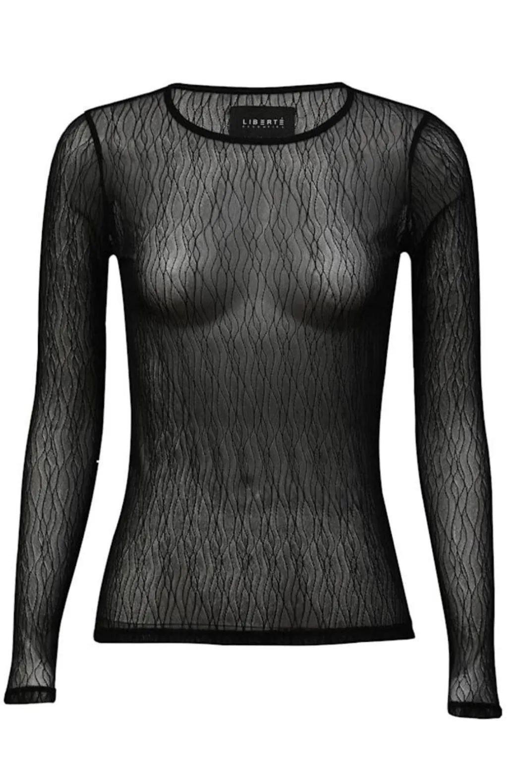 Sort blondebluse fra Liberte med bølget mønster og rund hals. Blusen har et gennemgående mønster i blonden og lange ærmer, der giver den et let og luftigt udtryk.