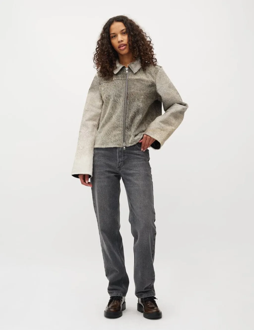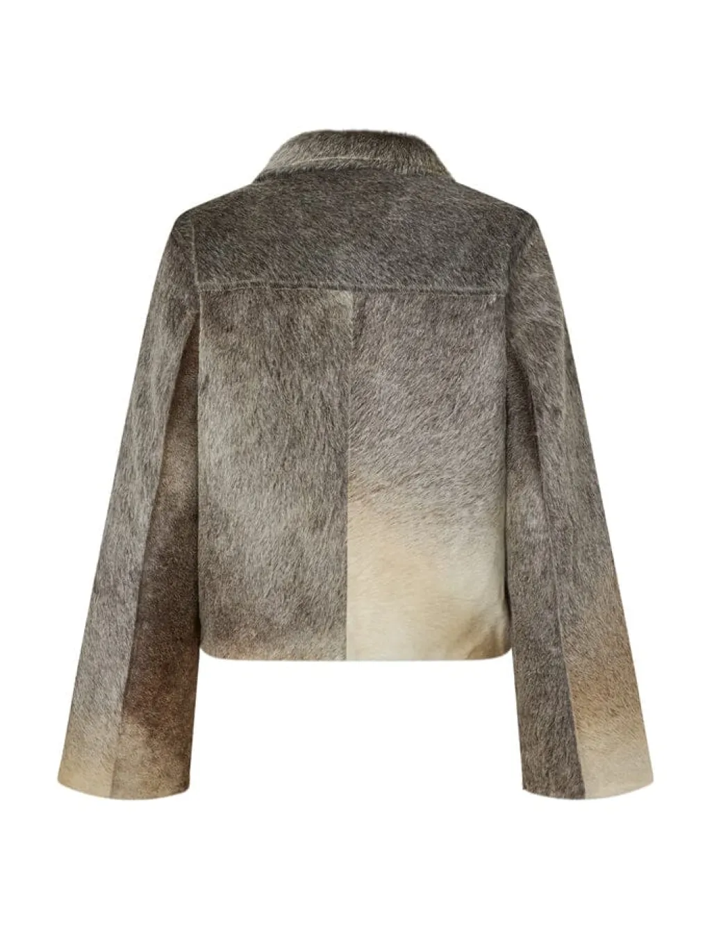 Jakke fra MbyM, lavet af koskind i en grå nuance med dyreprint. Jakken har en lynlås foran og dekorative syninger.