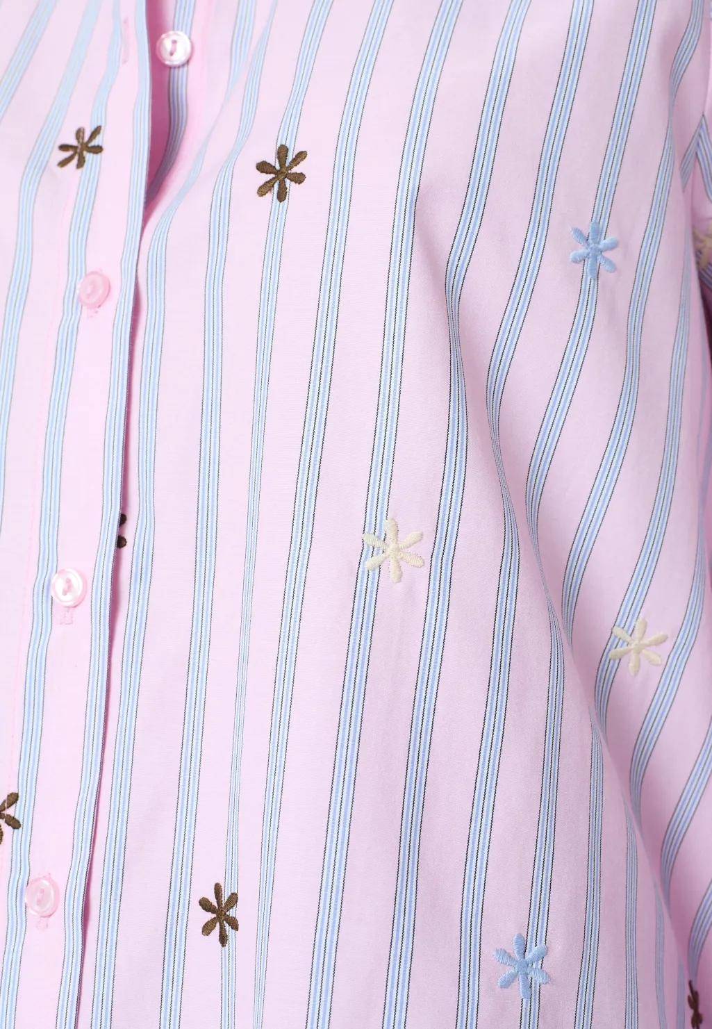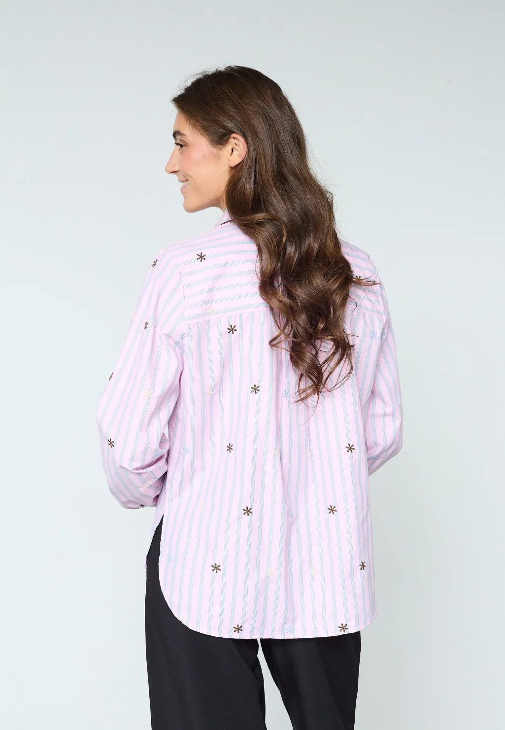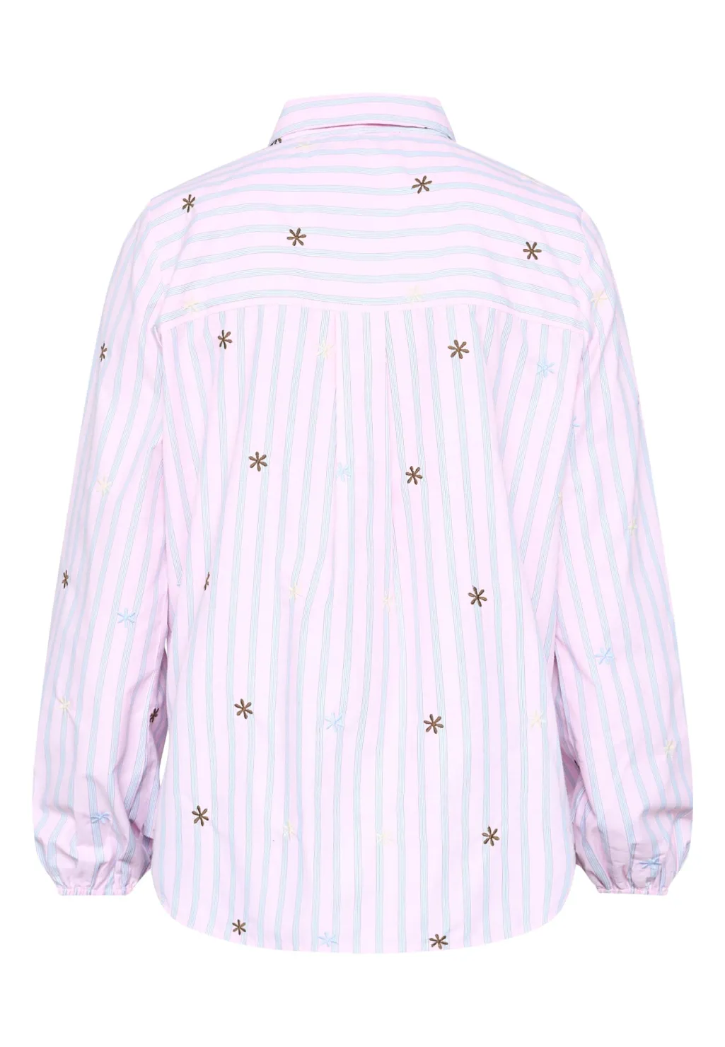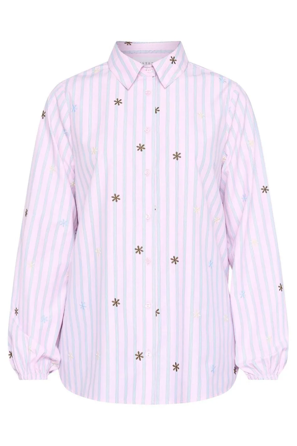 En stribet skjorte fra Sisters Point med broderede blomsterdetaljer. Skjorten har lyseblå og lyserøde striber på hvid bund.