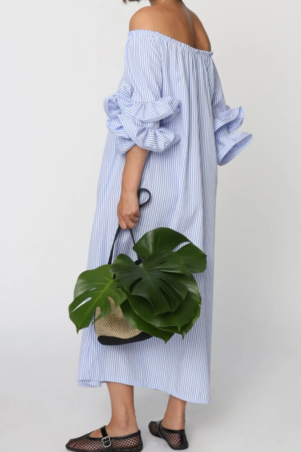 Blå- og hvidstribet kjole fra Cras med off-shoulder-design. Kjolen har puffede 3/4-ærmer med flæsedetaljer og går til anklerne.
