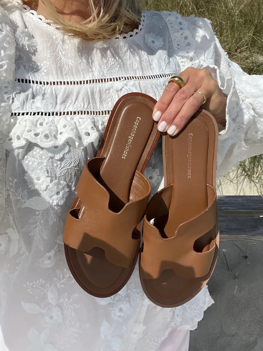 Lædersandal fra Copenhagen Shoes i en varm cognacfarve. Sandalen har en åben tå og er lavet med udskæringer på stropperne, der giver en luftig fornemmelse på foden.