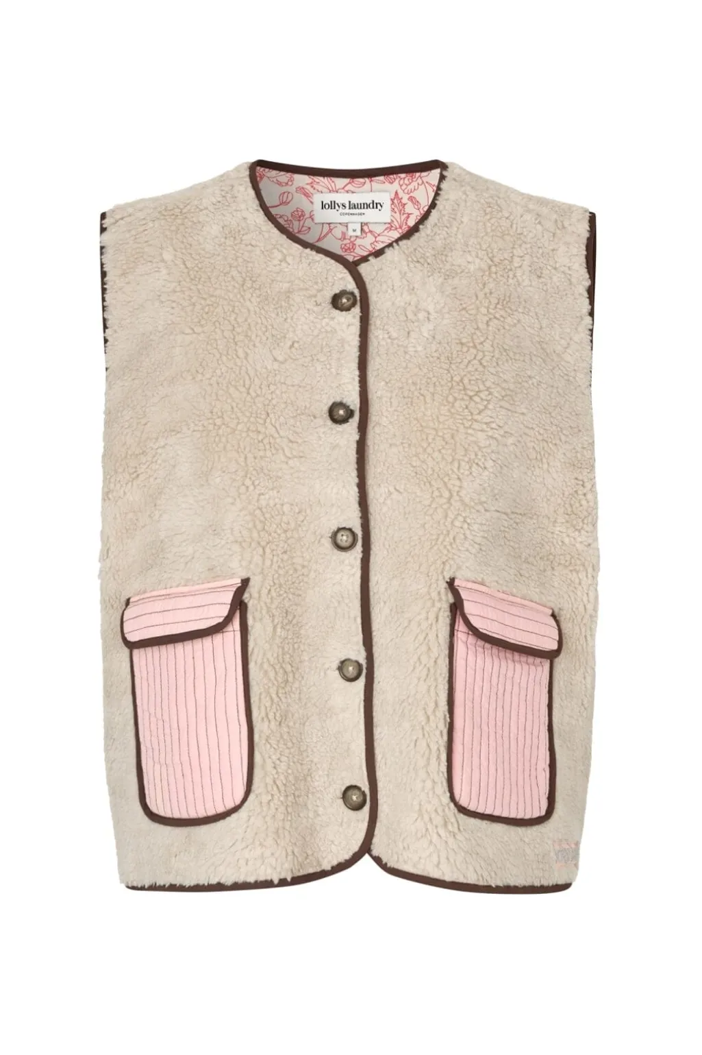 Beige vest fra Lollys Laundry med en blød, struktureret overflade. Vesten har en knappet front og to pink, stribede lommer på forsiden.