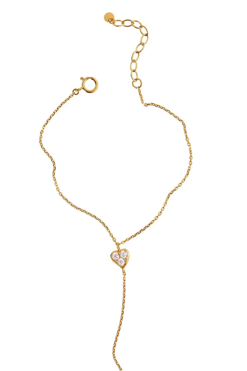 Armbånd fra Stine A med et hjerteformet vedhæng, der har tre skinnende zirkoner. Kæden er justerbar og lavet af forgyldt sterlingsølv.