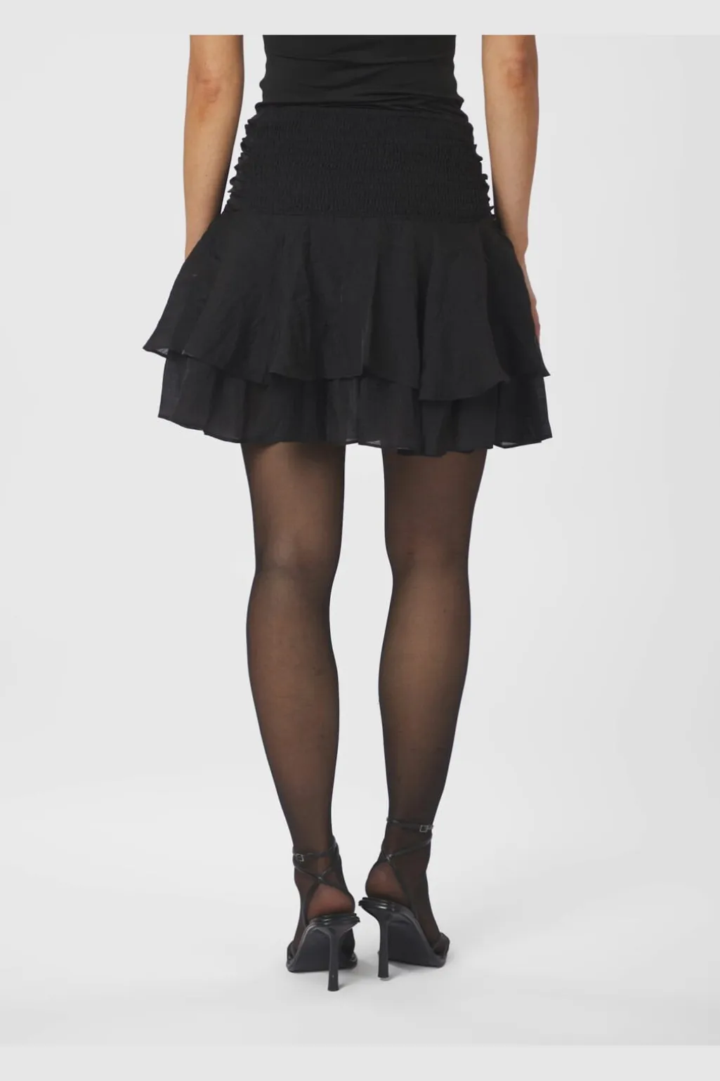 Sort nederdel fra Neo Noir med lagdelte flæsekanter og smock-detaljer i taljen. Den høje talje og det lette stof giver nederdelen god bevægelsesfrihed.