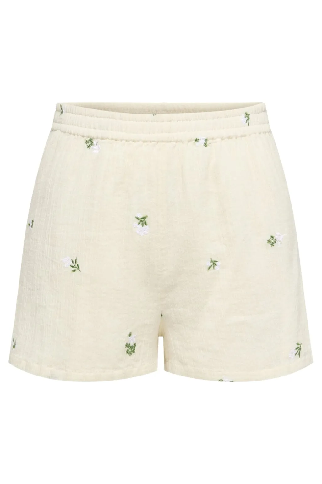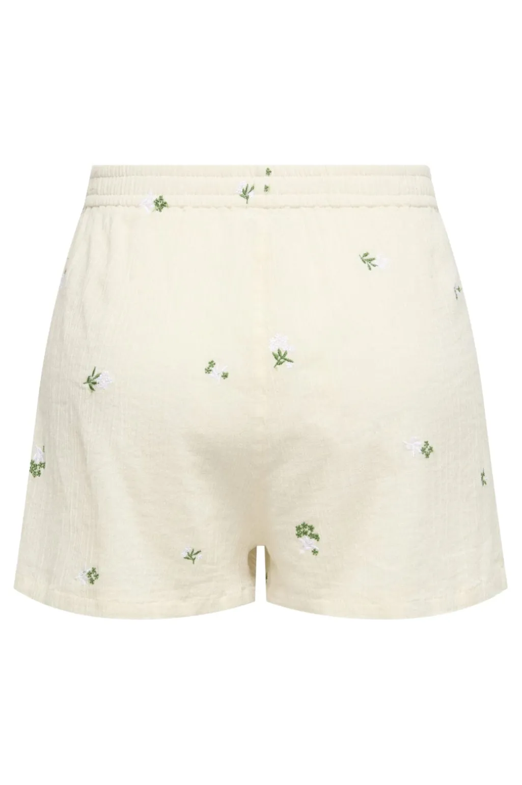 Cremefarvede shorts fra JDY med broderede blomster. De har en høj talje med elastisk linning og en kort længde til midt på låret.