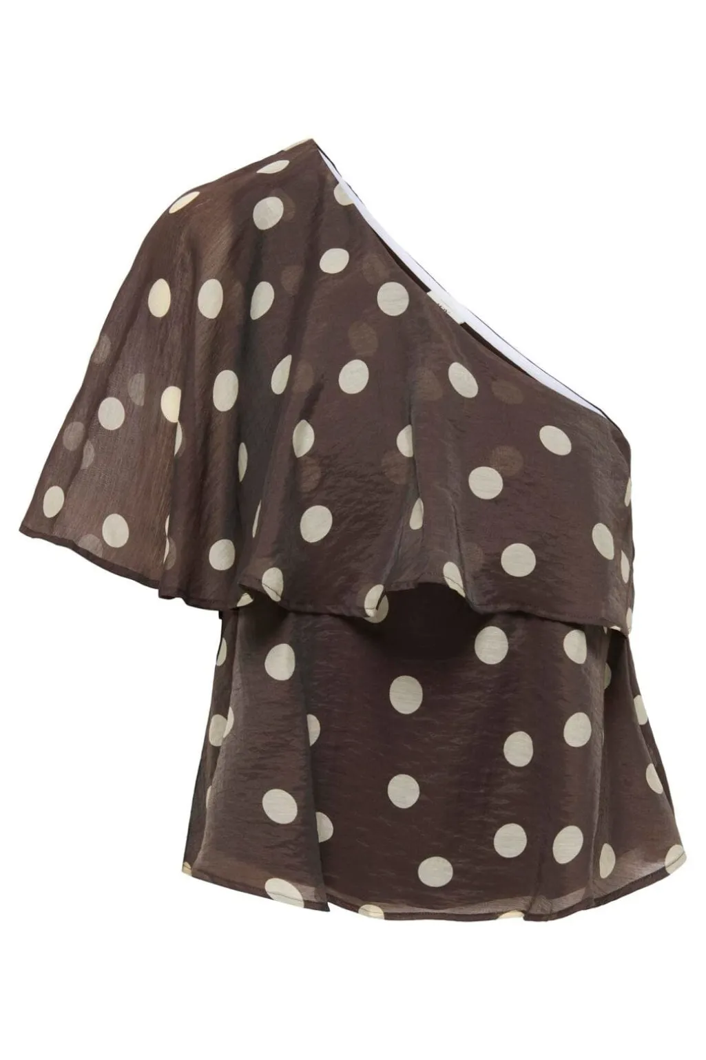 En skulderløs top fra JDY i mørkebrun med hvide polkaprikker. Toppen har et asymmetrisk design med rynker og et lagdelt snit.