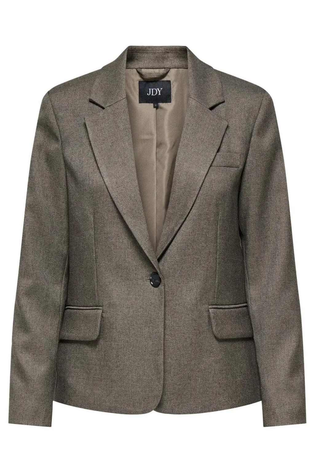 Blazer fra JDY i en brun-grå melangefarve. Lavet af 100% polyester med en klassisk reverskrave og enkelt knaplukning.