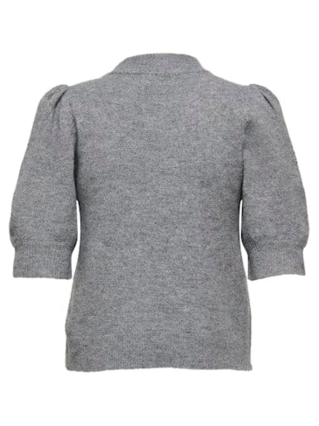 Grå meleret pullover fra JDY med hvide perler på forsiden. Pulloveren har korte ærmer og en høj hals.