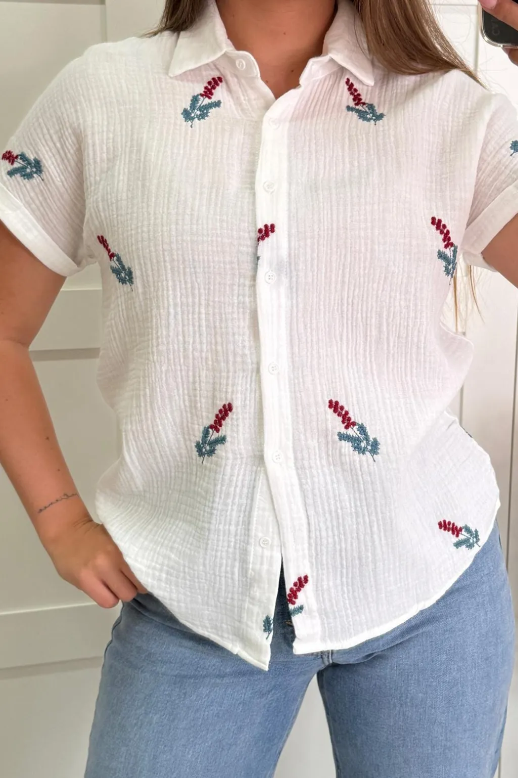 Hvid skjorte fra A-bee med rødt og blåt broderi. Skjorten har korte ærmer med ombuk og en løs pasform, der giver god bevægelsesfrihed.