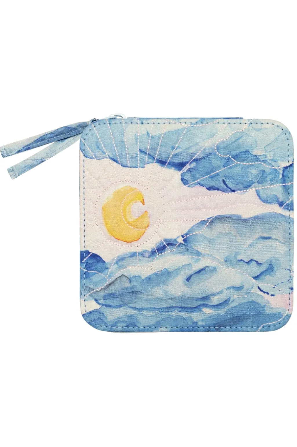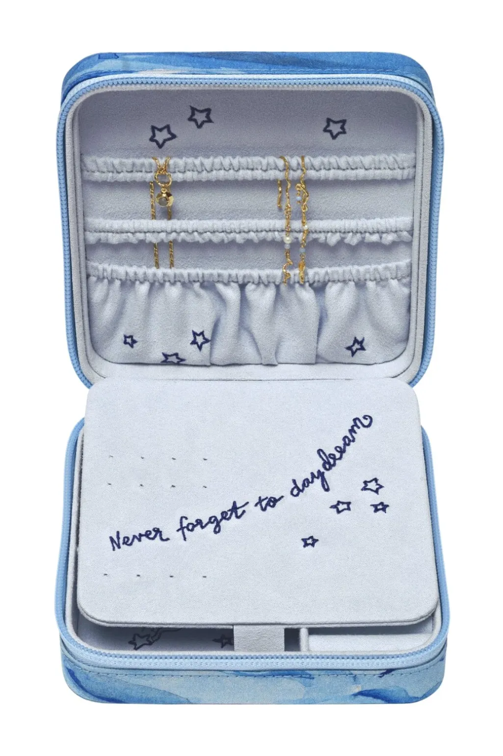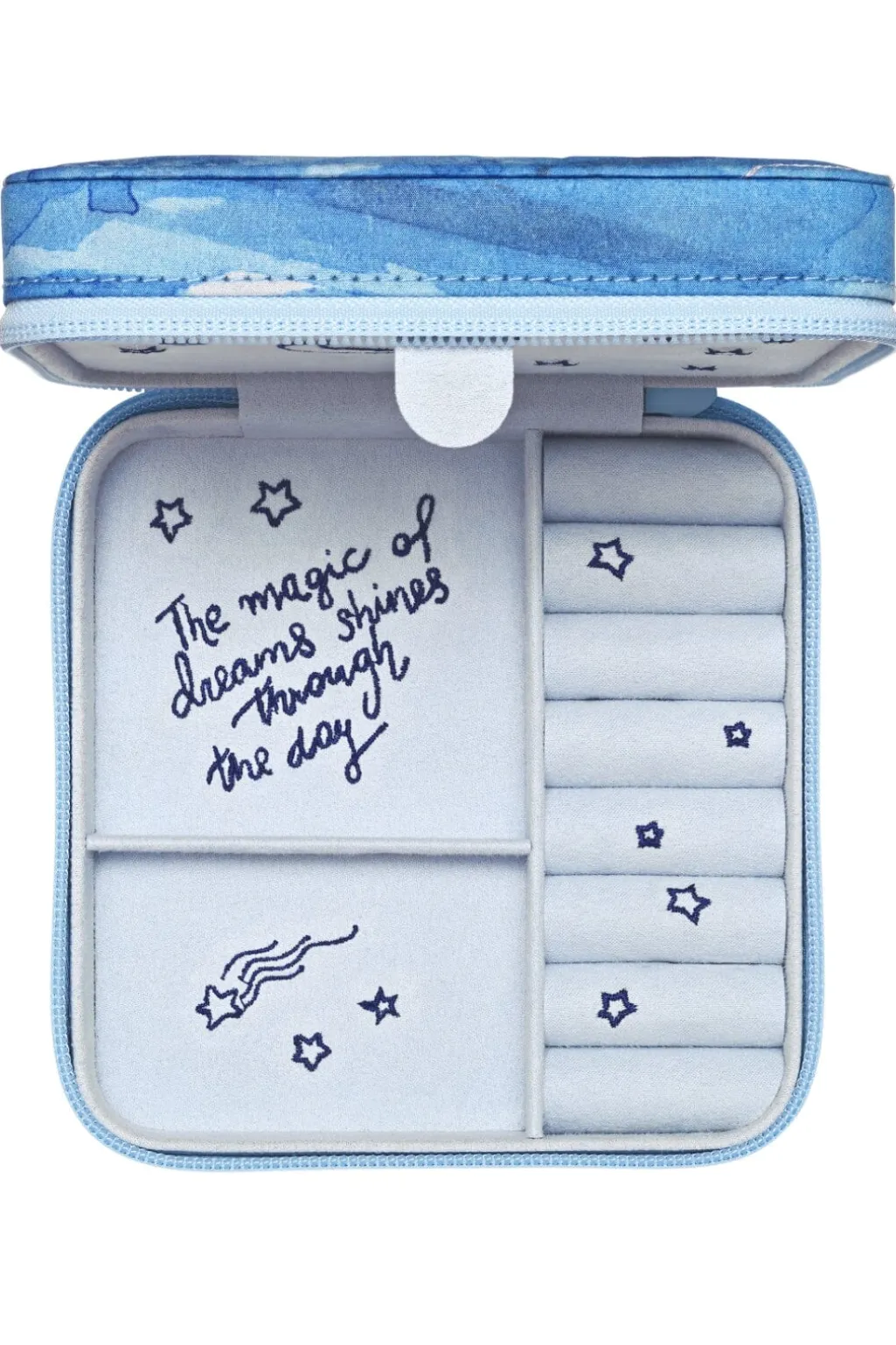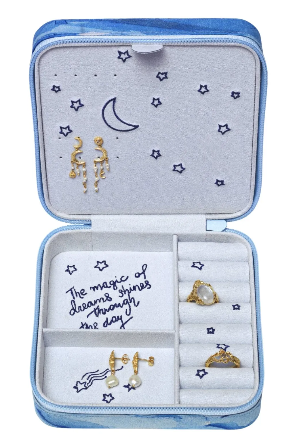Blå smykkeæske fra Maanesten med blødt indvendigt stof og separate rum til smykker. Æsken har et design med stjerner og måne på den hvide inderside.