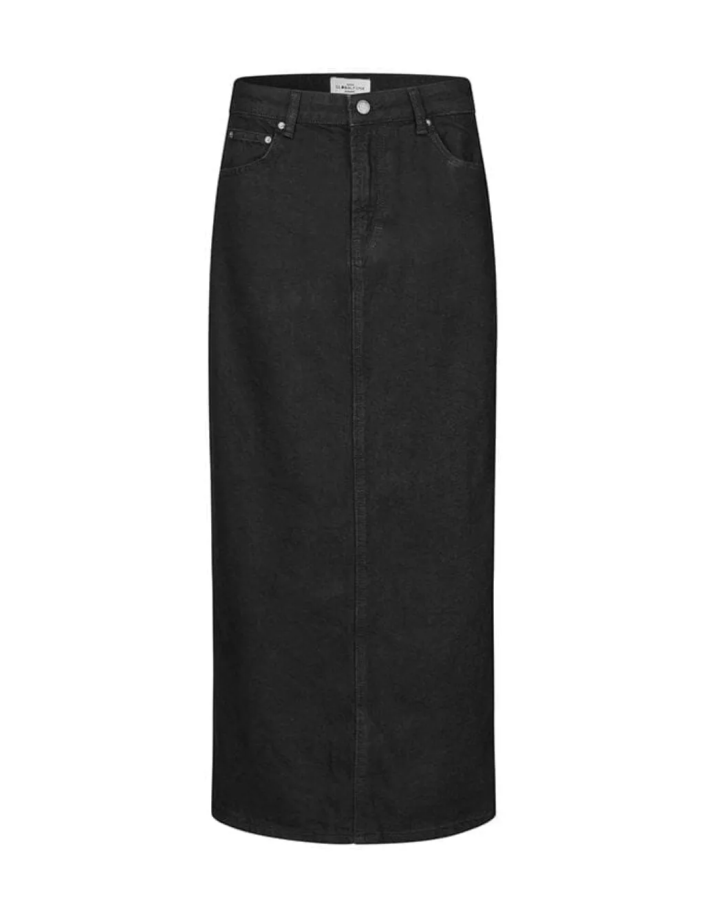 Lang denimnederdel fra Global Funk i farven Black Mix. Nederdelen har en lige pasform med høj talje og knaplukning foran.