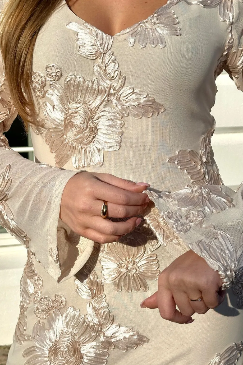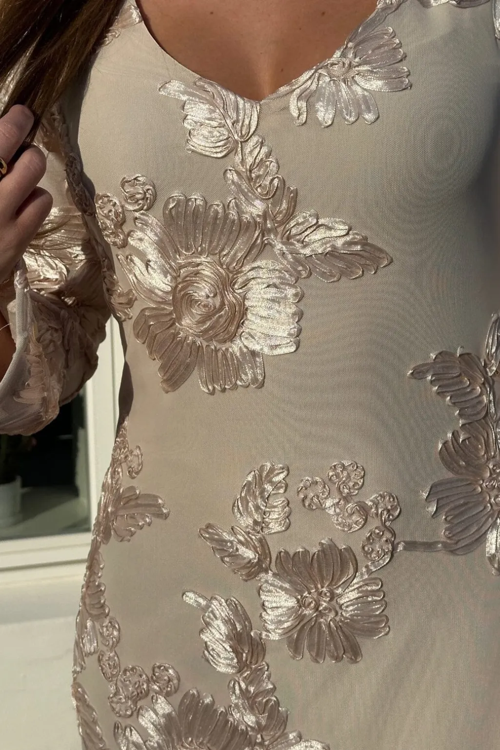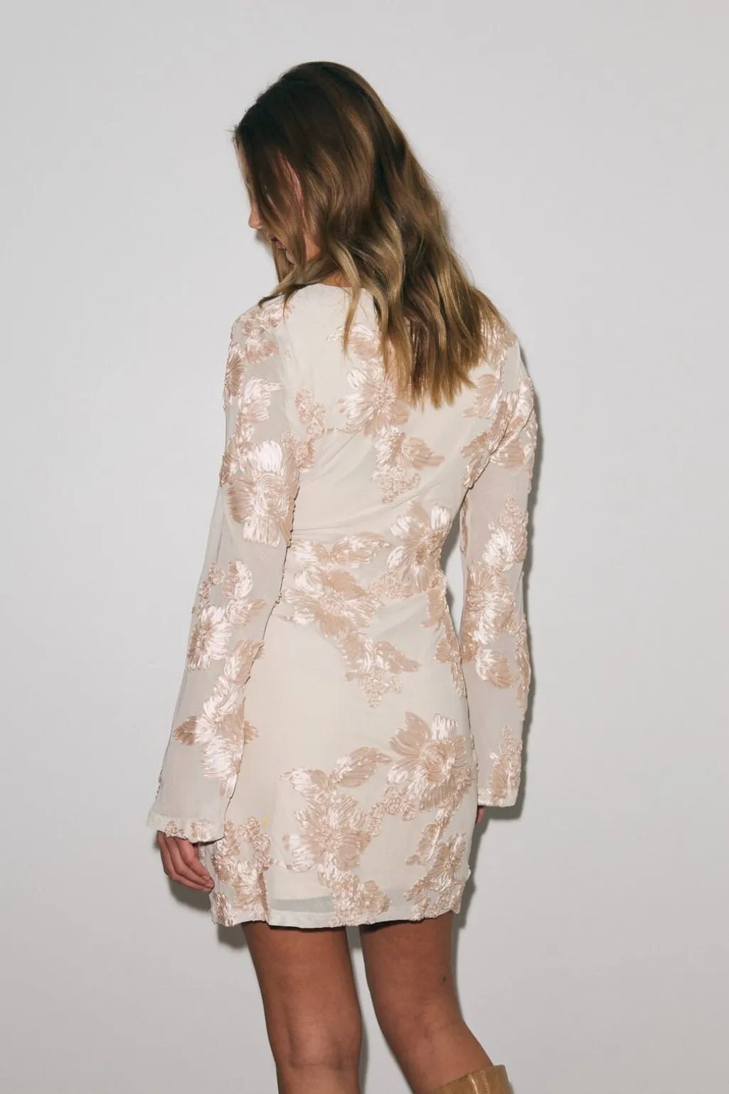 Kortærmet meshkjole fra Noella i cremehvid. Kjolen har broderede blomster over hele designet og en V-halsudskæring. De lange ærmer og lårlængden gør den brugbar året rundt.