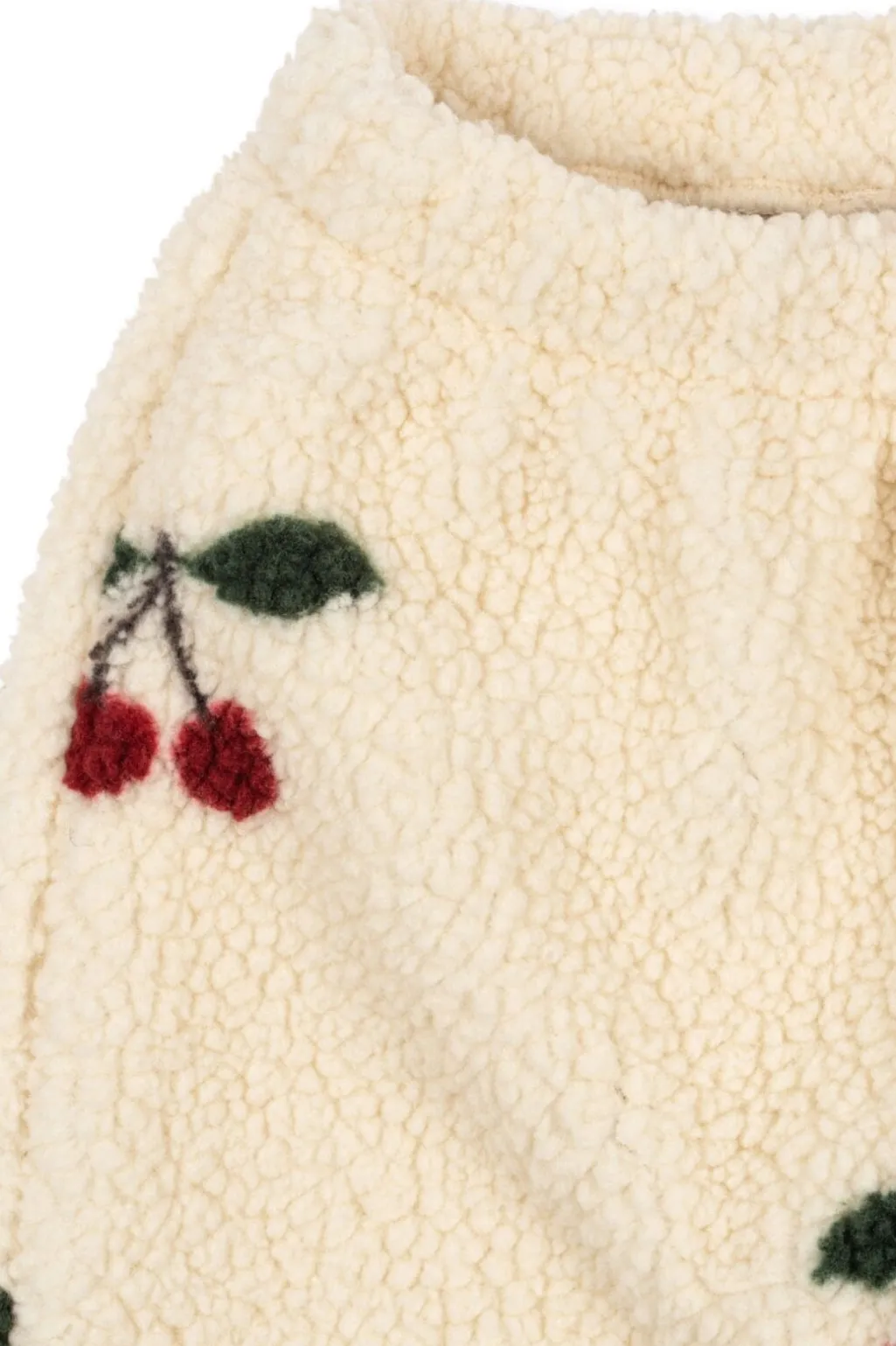 Cremefarvede bukser fra Konges Sløjd med et kirsebærmønster over hele stoffet. Bukserne har en blød, struktureret overflade med elastik i taljen og anklerne.