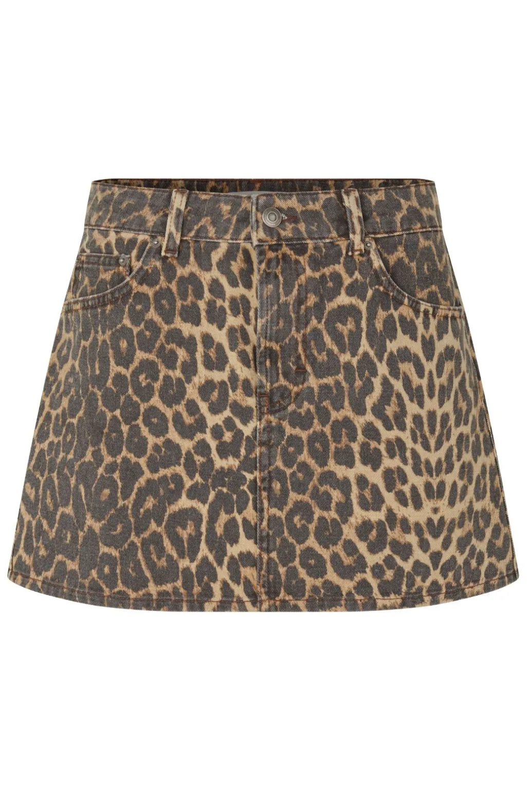 Denimnederdel fra Global Funk i brune og beige nuancer med leopardmønster. Nederdelen har en A-formet silhuet og synlige lommer både foran og bagpå.