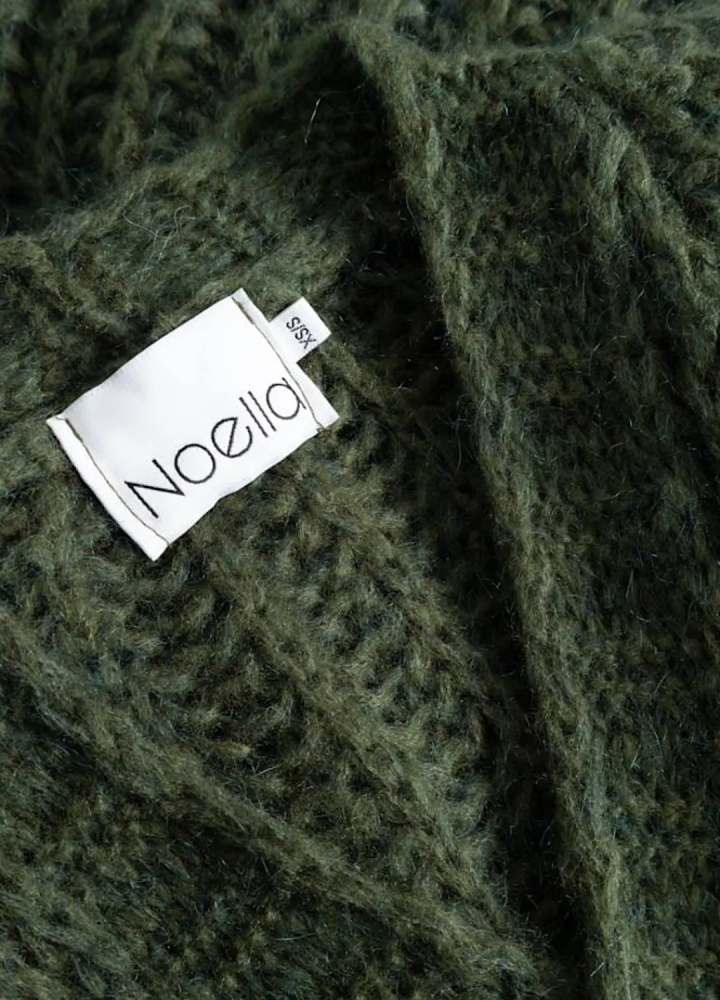 Armygrøn cardigan fra Noella med løs pasform og åben front. Den ribstrikkede tekstur og de let puffede ærmer giver cardiganen et afslappet udtryk.