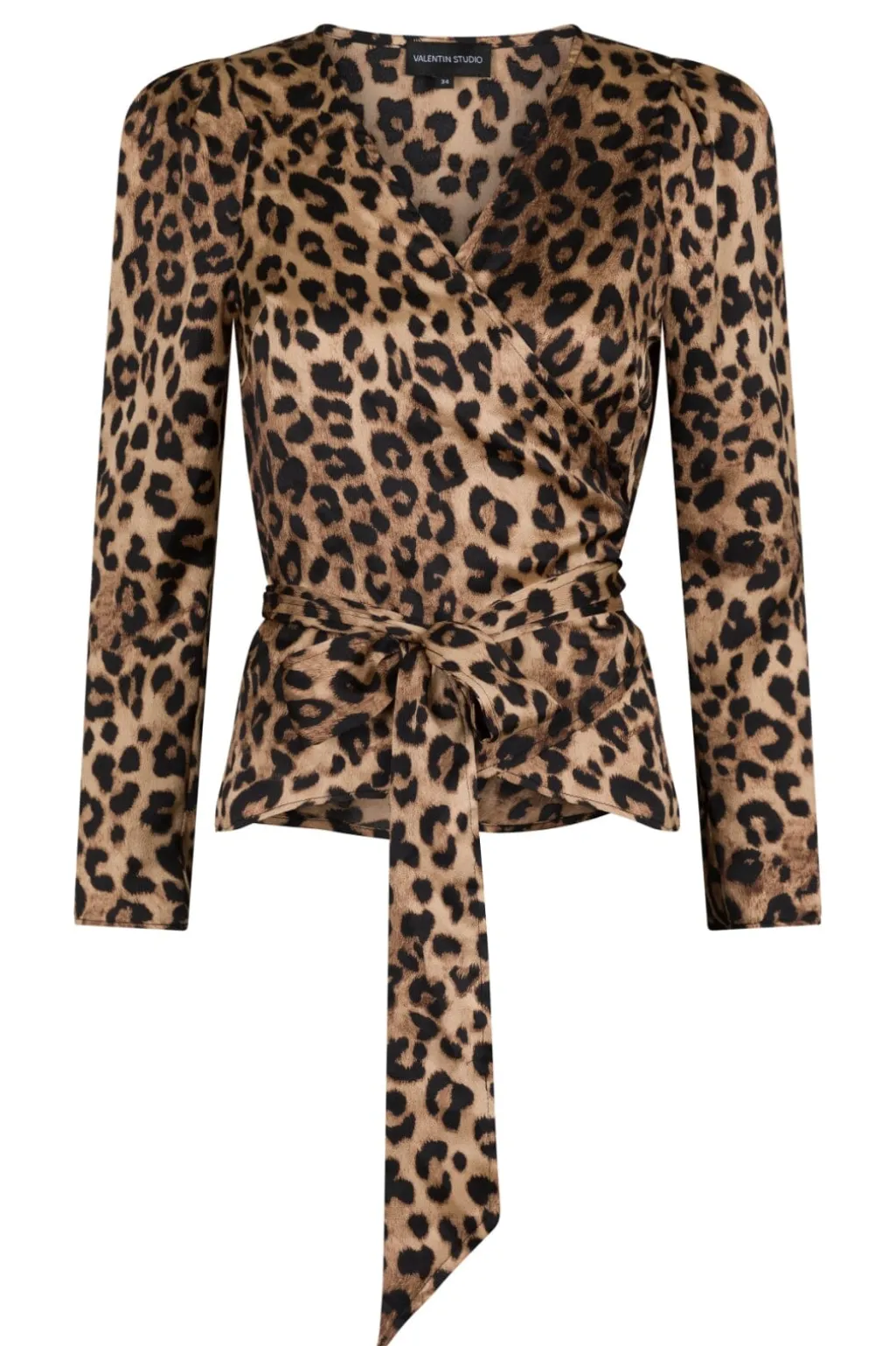 Slå-om-bluse fra Valentin Studio i brune og beige leopardprint. Blusen har V-halsudskæring, lange ærmer og bindebånd i taljen, der skaber en fin silhuet.