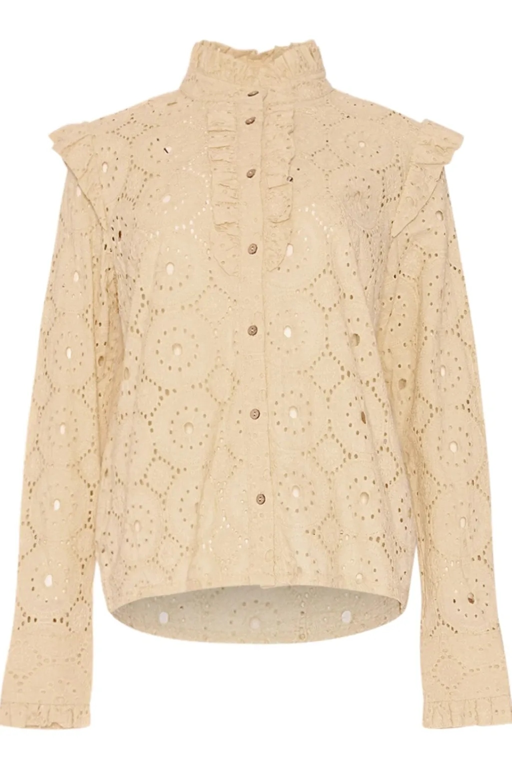 Ivory skjorte fra Noella i blondeagtigt broderi med høj hals og flæser. Skjorten har lange ærmer og knaplukning foran. Det gennembrudte mønster giver et luftigt udtryk.