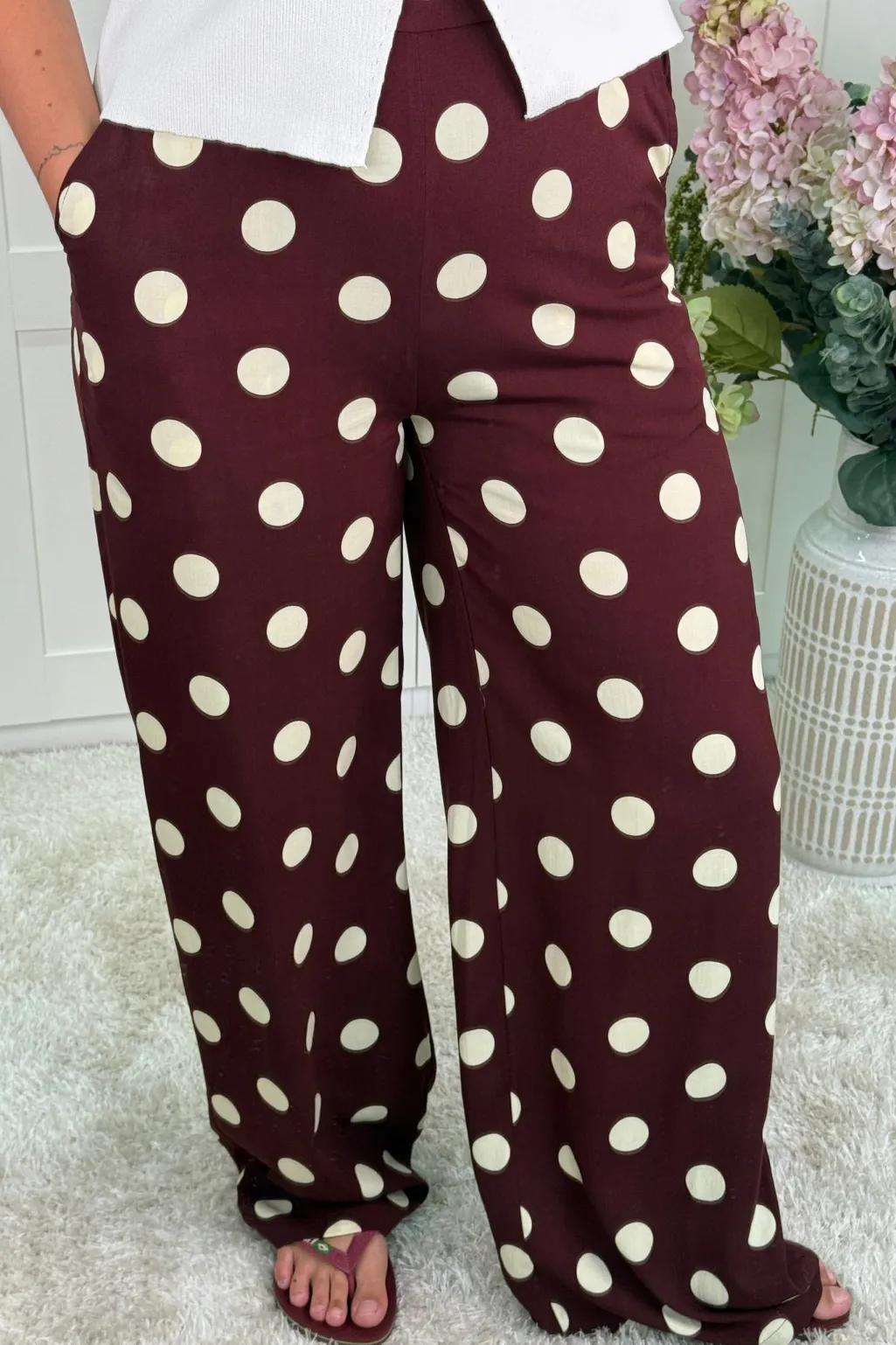 Brede bukser fra A-bee i en mørk brun nuance med store beige polkaprikker. Bukserne er lavet af 100 % viskose.
