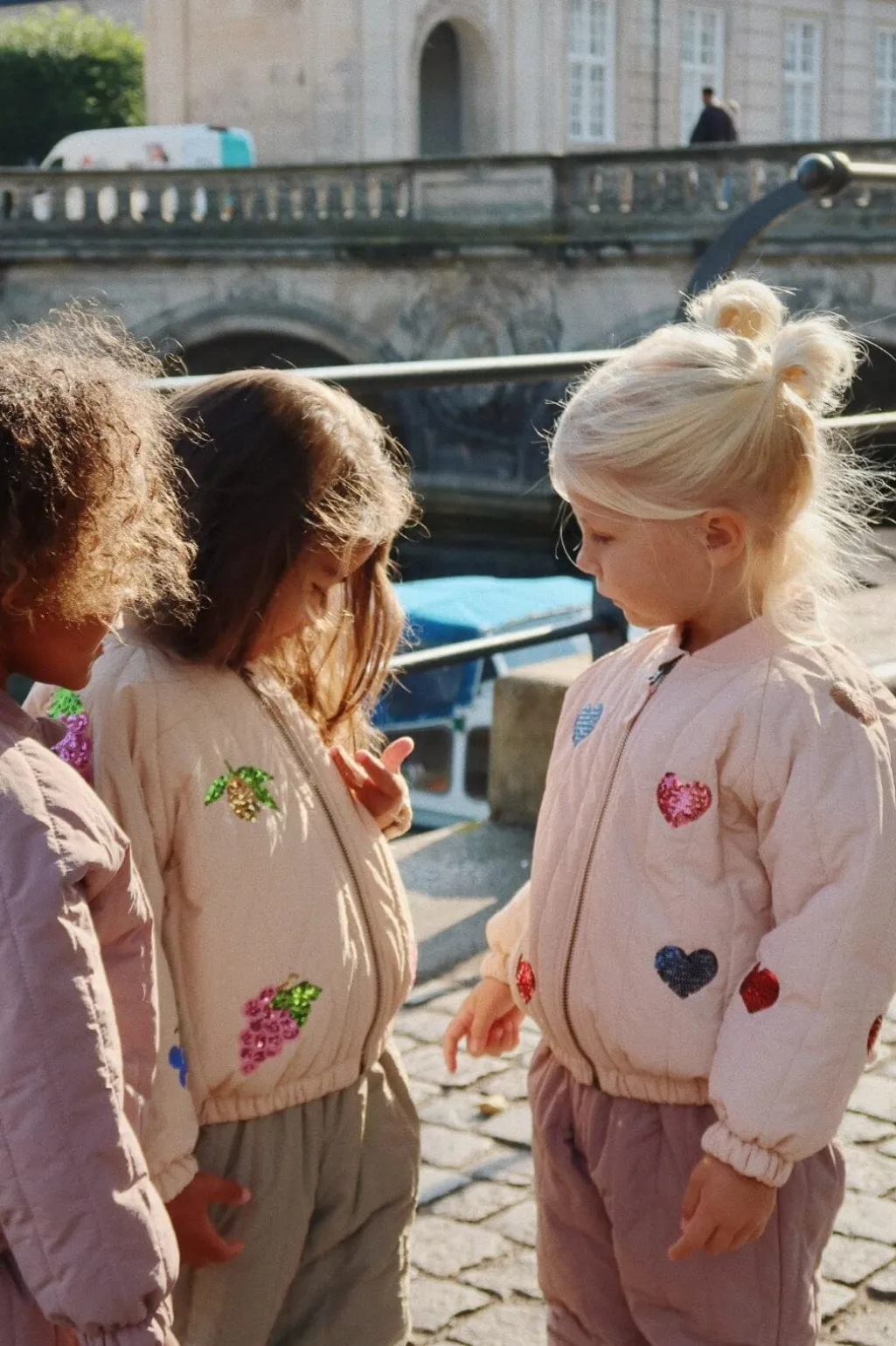 Bomberjakke fra Konges Sløjd i lyserød og beige nuance med hjerteformede pailletter i forskellige farver på forsiden.