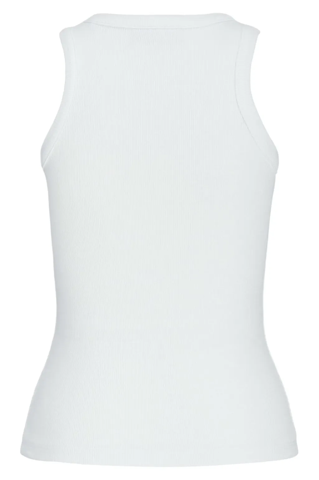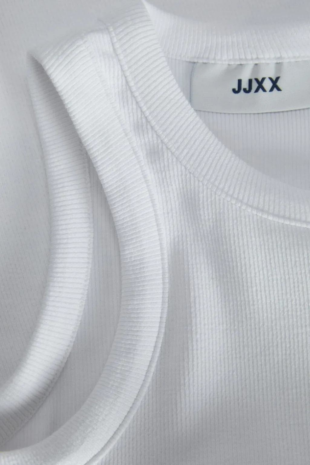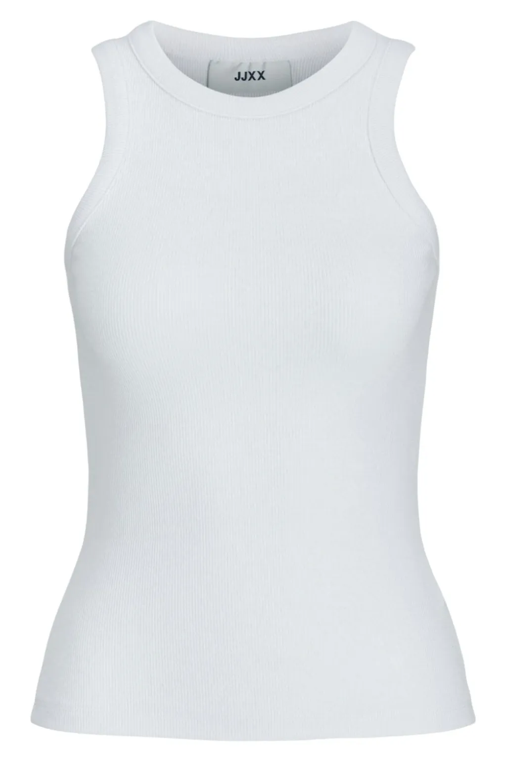 Hvid ribstrikket top fra Jjxx med tætsiddende pasform. Den ærmeløse top har en rund halsudskæring og er fremstillet i en blød bomuldsblanding med stræk.