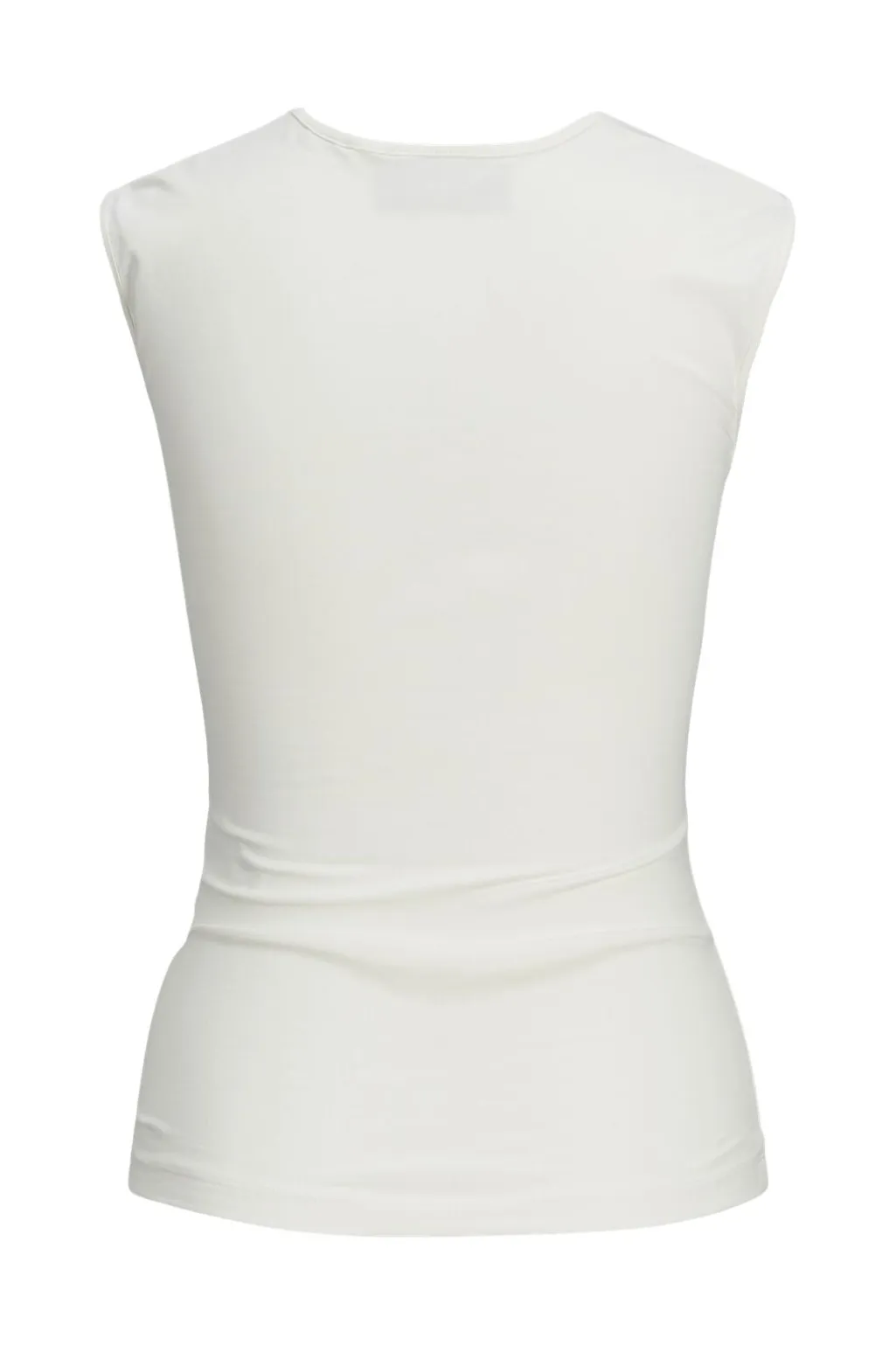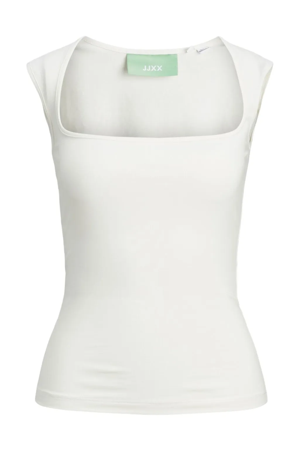 Ærmeløs top fra Jjxx i en lys cremehvid nuance. Toppen har en tætsiddende pasform med stretch og en firkantet halsudskæring, der fremhæver halsen og kravebenene.