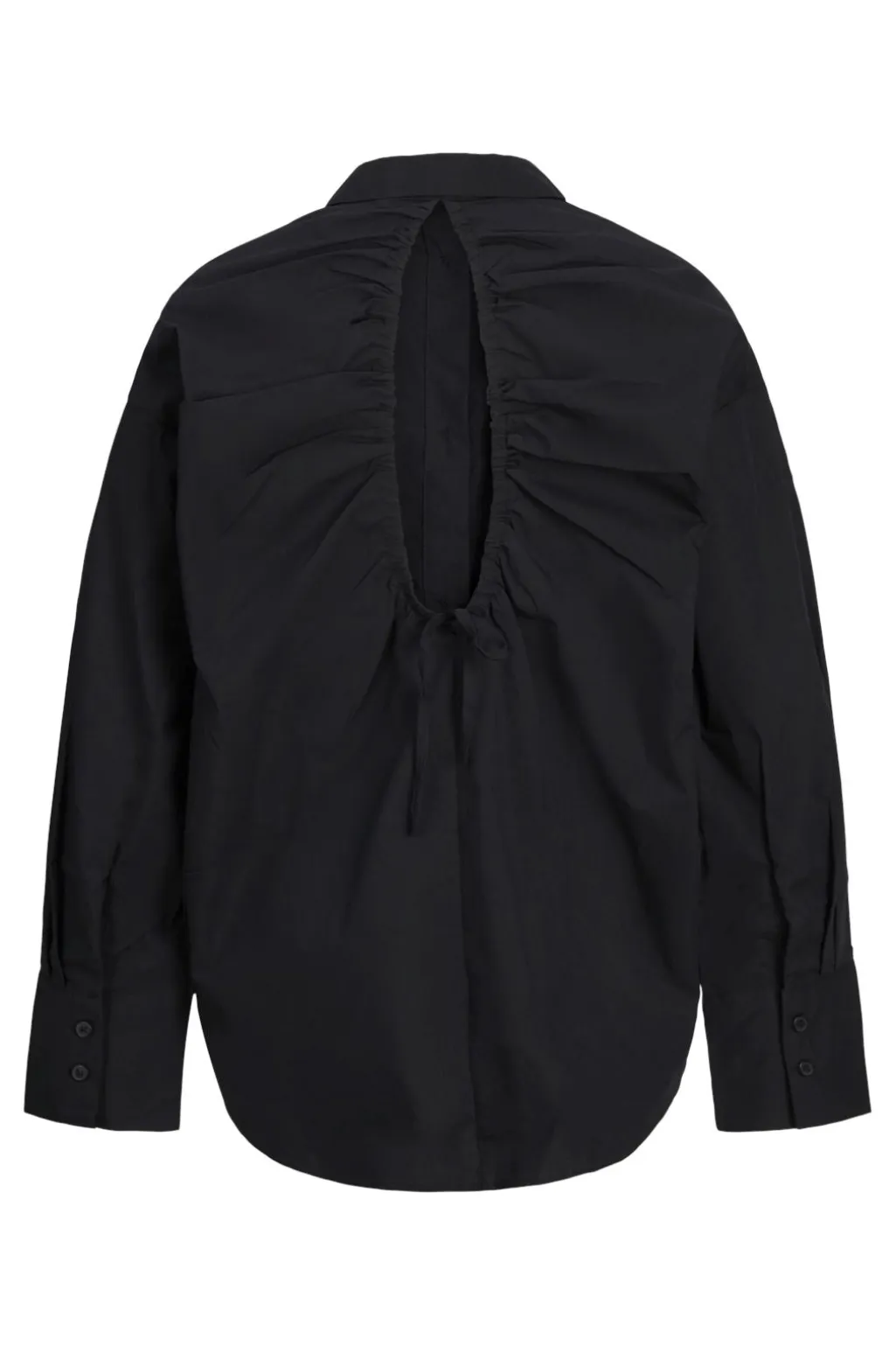 Sort skjorte fra Jjxx med en oversized pasform. Skjorten har skjortekrave, lange ærmer og detaljer med bindebånd og flæser, der giver den et personligt præg.