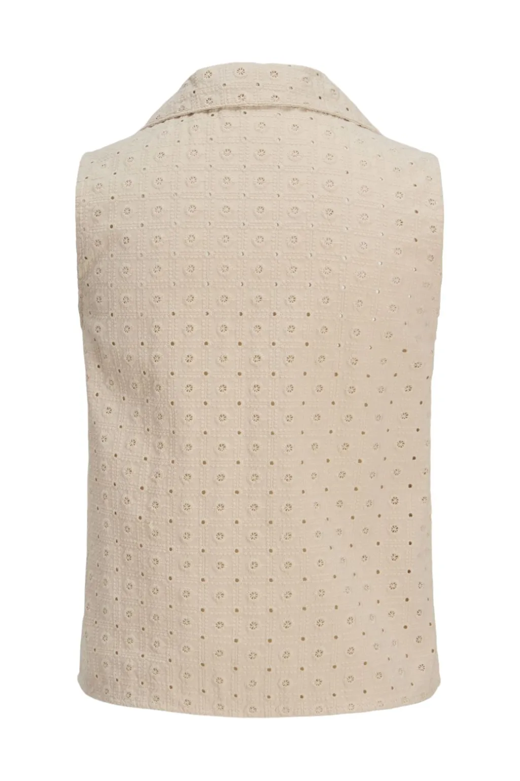 Ærmeløs top fra Jjxx i en lys cremefarvet nuance. Toppen har broderie anglaise-mønster med små blomster og øjehuller, lynlåslukning foran og en klassisk skjortekrave.