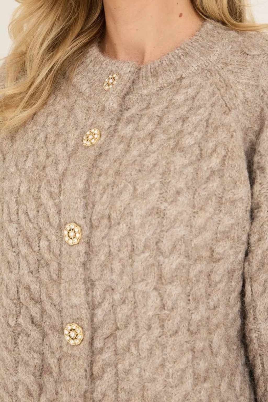 Lysebrun cardigan fra A-View med et struktureret strikmønster. Den har en løs pasform og rund halsudskæring med perlelignende knapper til lukning foran.