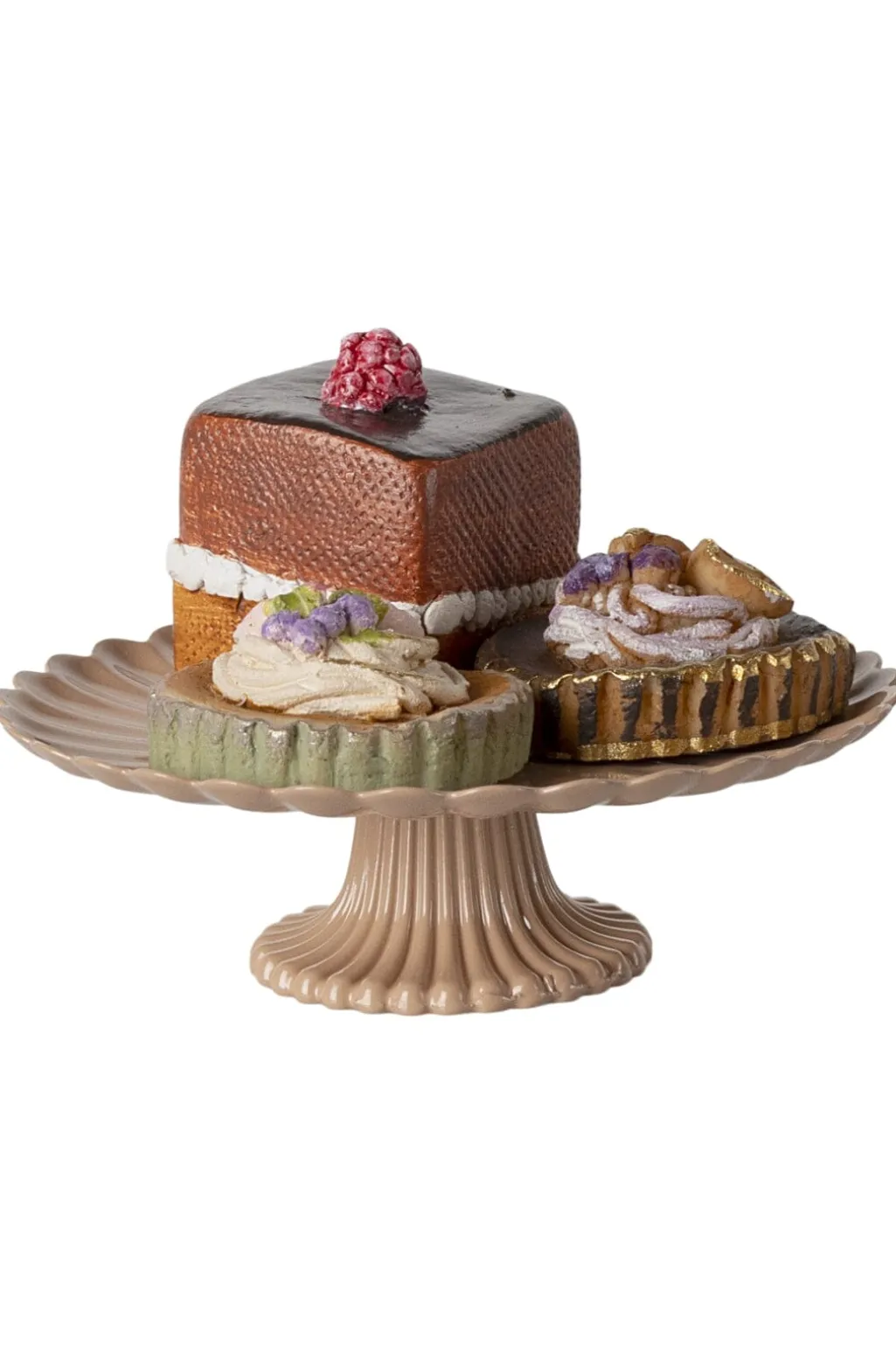 Rosa kagefad i miniature fra Maileg med bølgede kanter og dekorativ fod. Fadet kommer med tre forskellige mini-desserter: en kage med hindbær og to småkager.