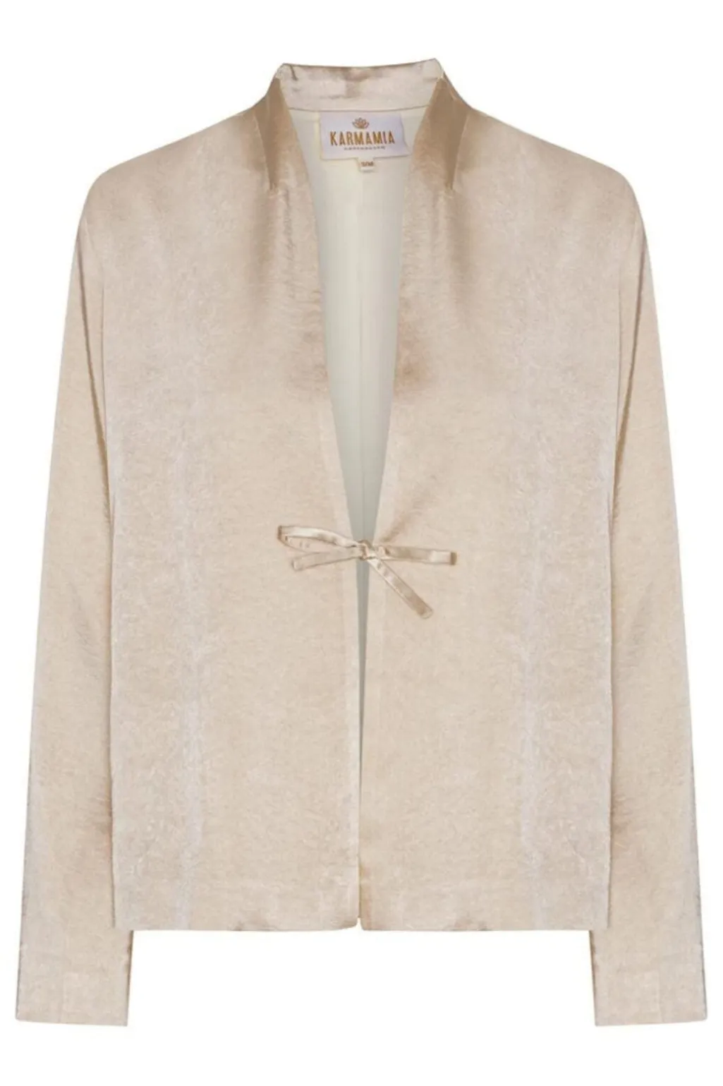 Satinjakke fra Karmamia i antik hvid. Den har v-udskæring med sjalskrave og et bindebånd foran.