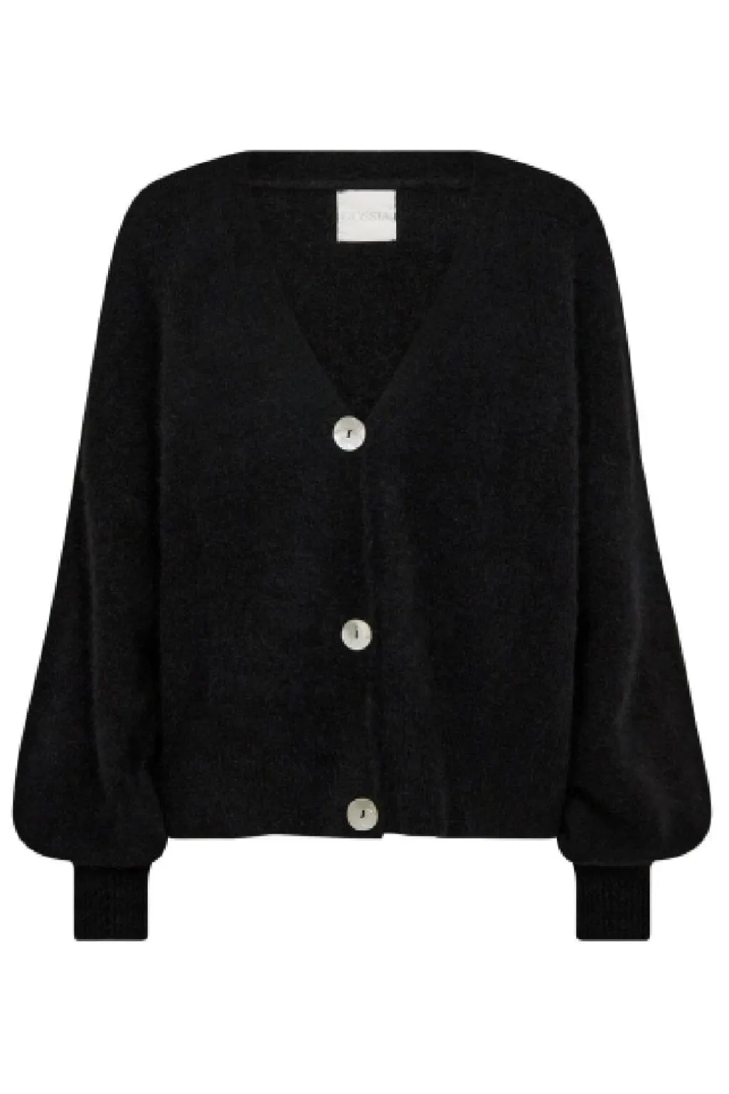 Sort cardigan fra Gossia med v-hals og tre knapper foran. Cardiganen har puffede ærmer med smalle manchetter og kan styles over en kjole eller med jeans.
