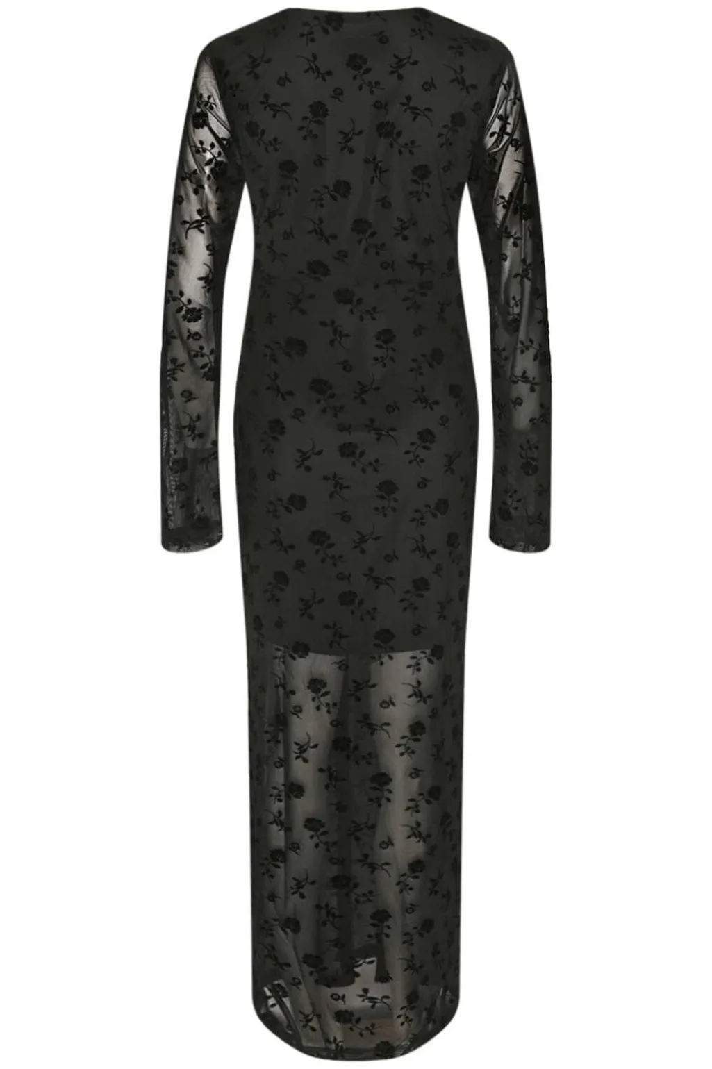 Sort kjole fra Noella med blomsterprint i sorte og lilla nuancer. Kjolen har v-udskæring, lange ærmer, flæser og lang længde.
