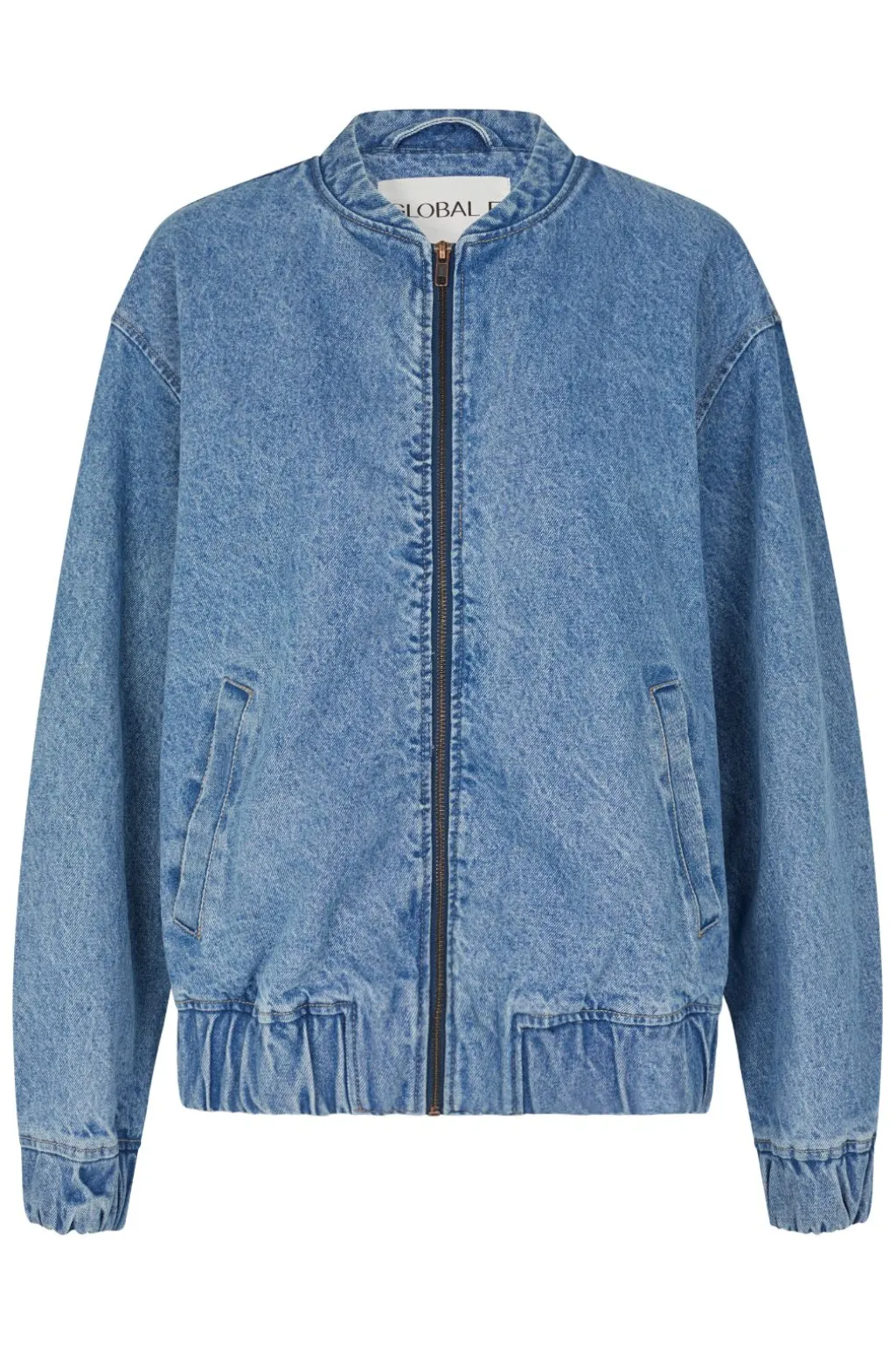 Denimjakke fra Global Funk i vintage blå med acid wash-effekt. Jakken har en rund hals og lynlåslukning foran. De praktiske sidelommer og lange ærmer gør jakken brugbar året rundt.