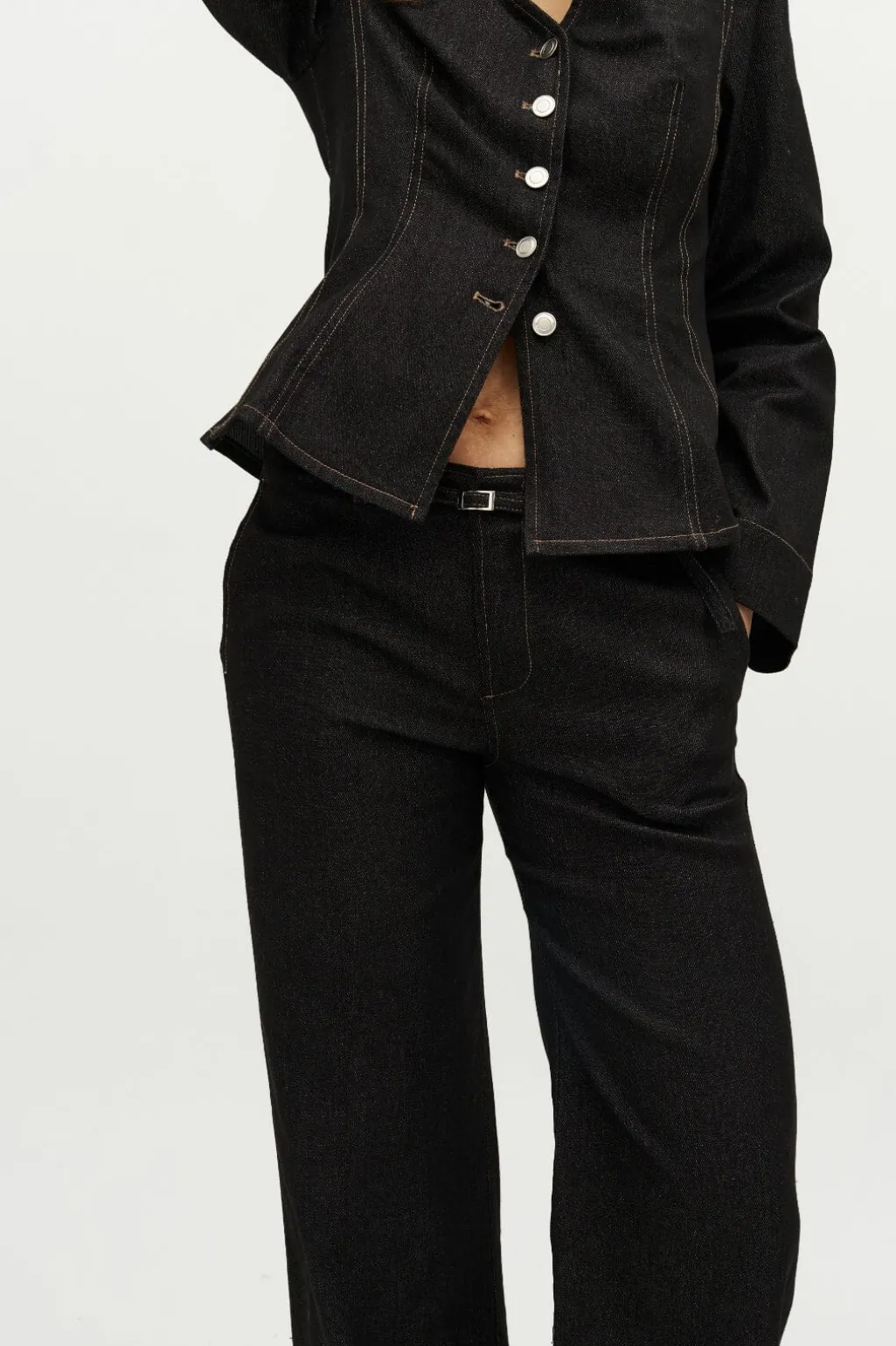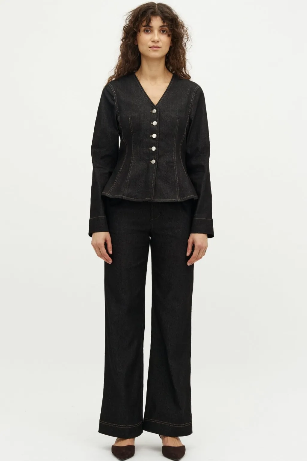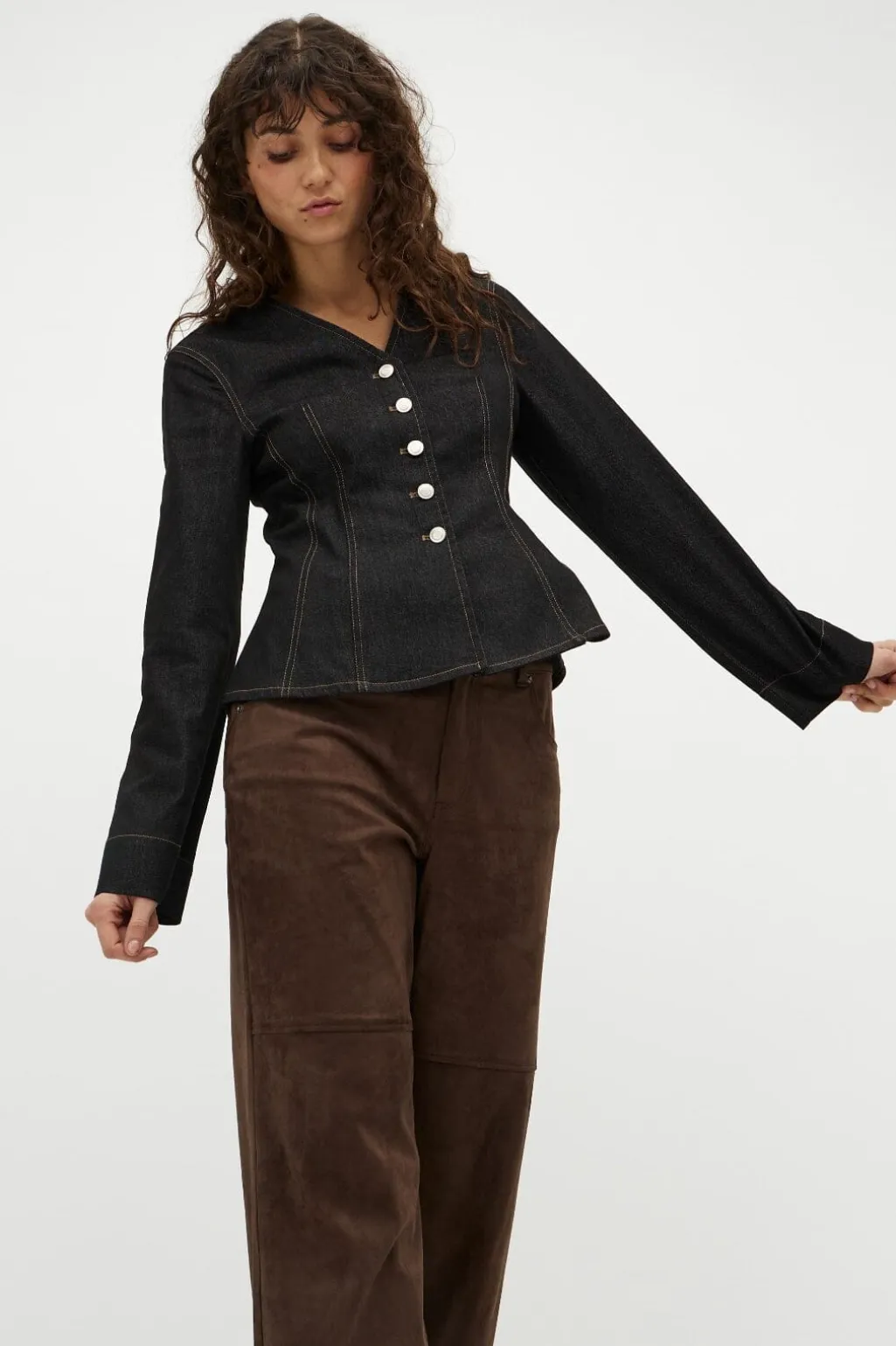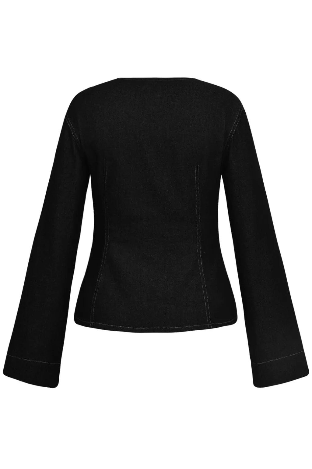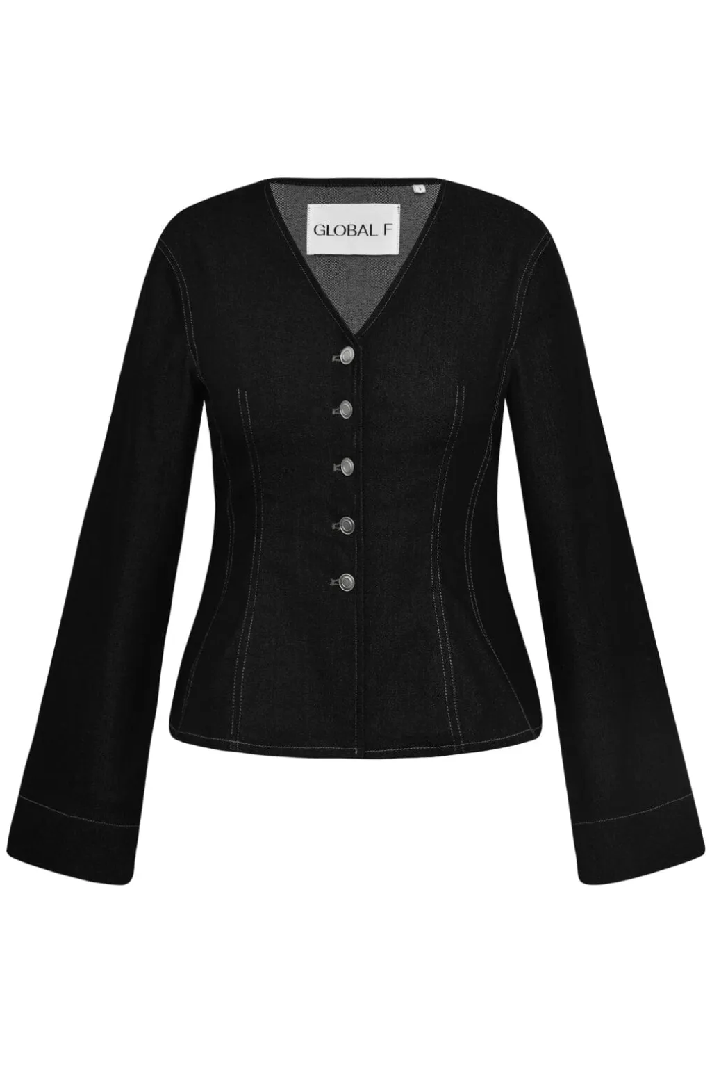 Sort jakke fra Global Funk med v-hals og knaplukning. Jakken har lange ærmer og dekorative syninger, der fremhæver dens struktur.
