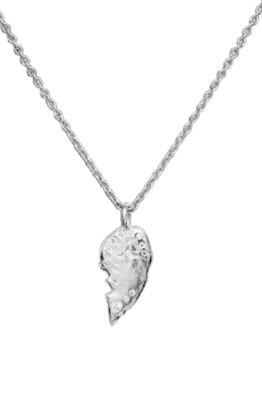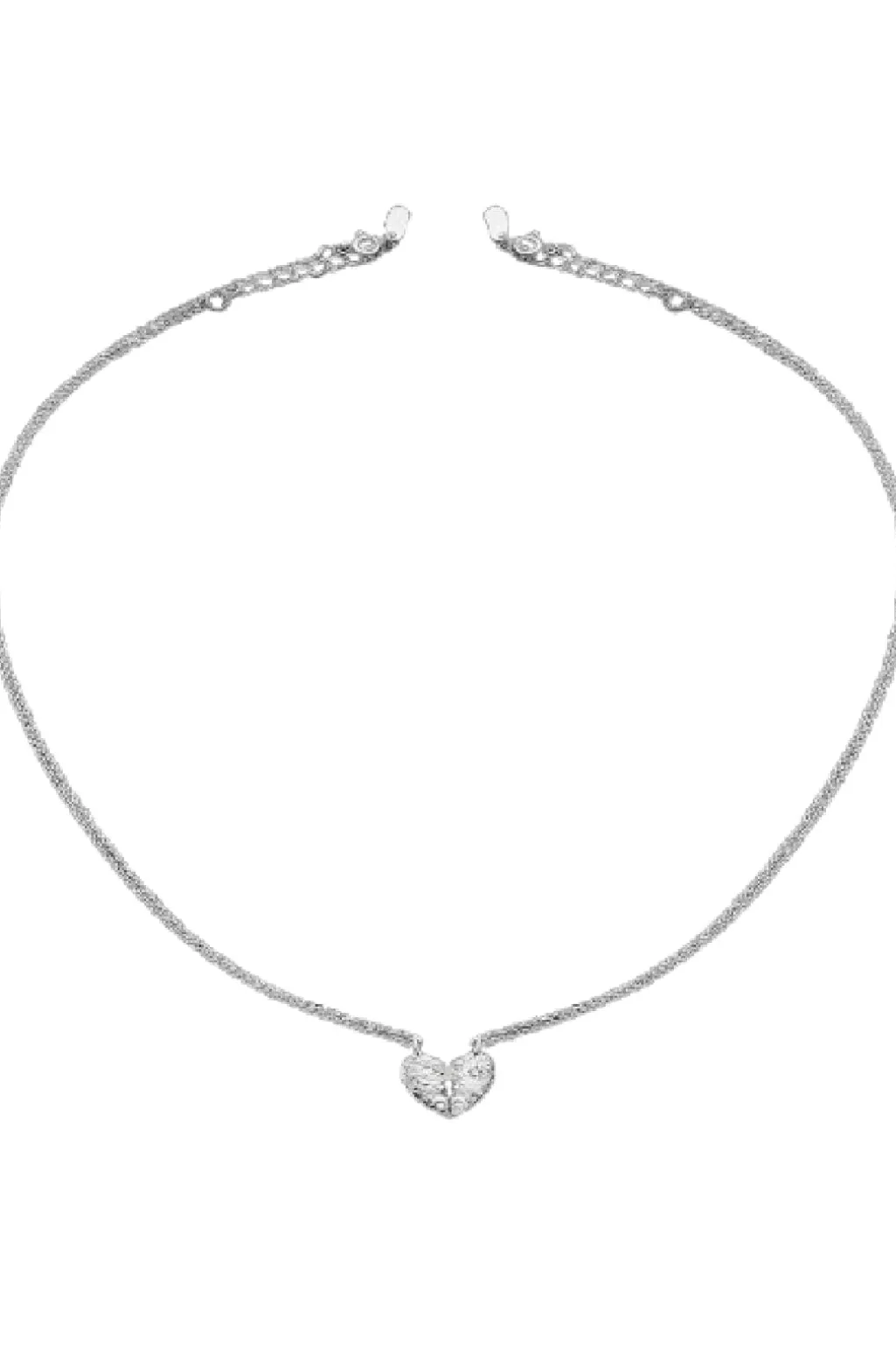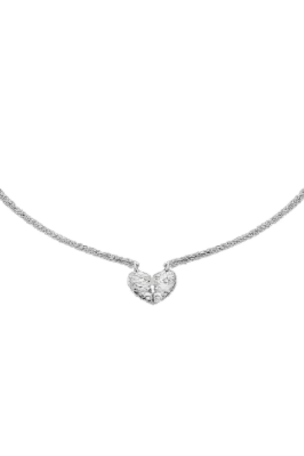 Sølvhalskæde fra Maanesten med et hjertevedhæng i to halvdele. Halskæden har en dobbeltkæde og er fremstillet af genanvendt sterling sølv med en blank overflade.