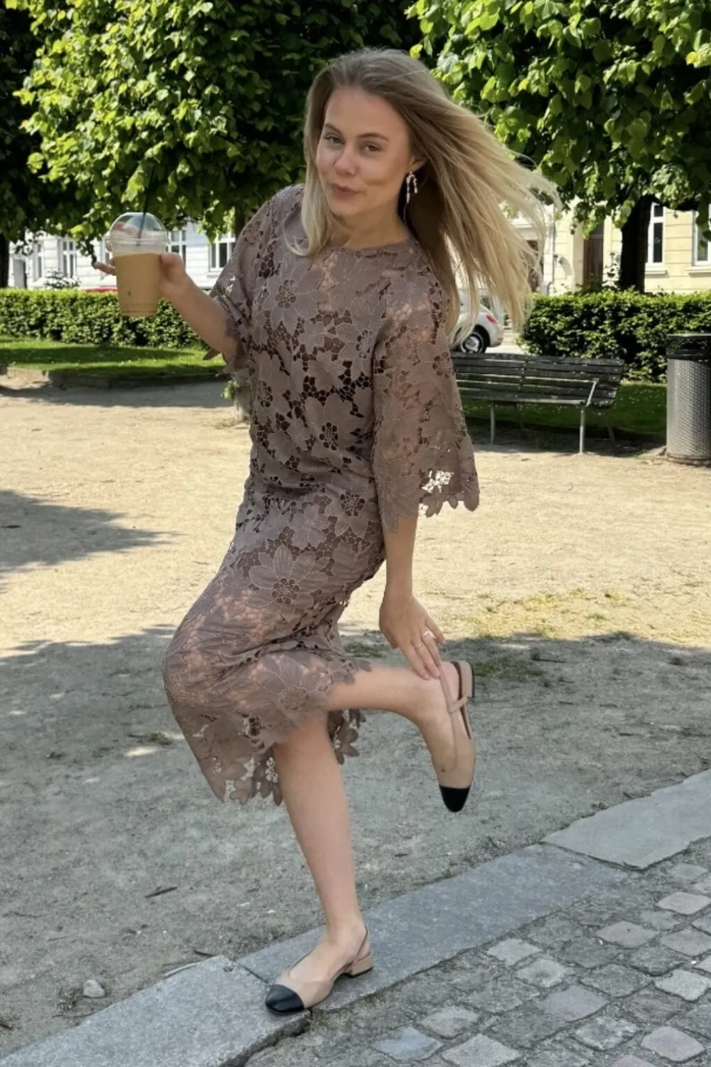 Lang blondekjole i mocca-brun fra BYIC. Kjolen har et gennemgående blomstermønster i blonde og skal bæres med en underkjole.