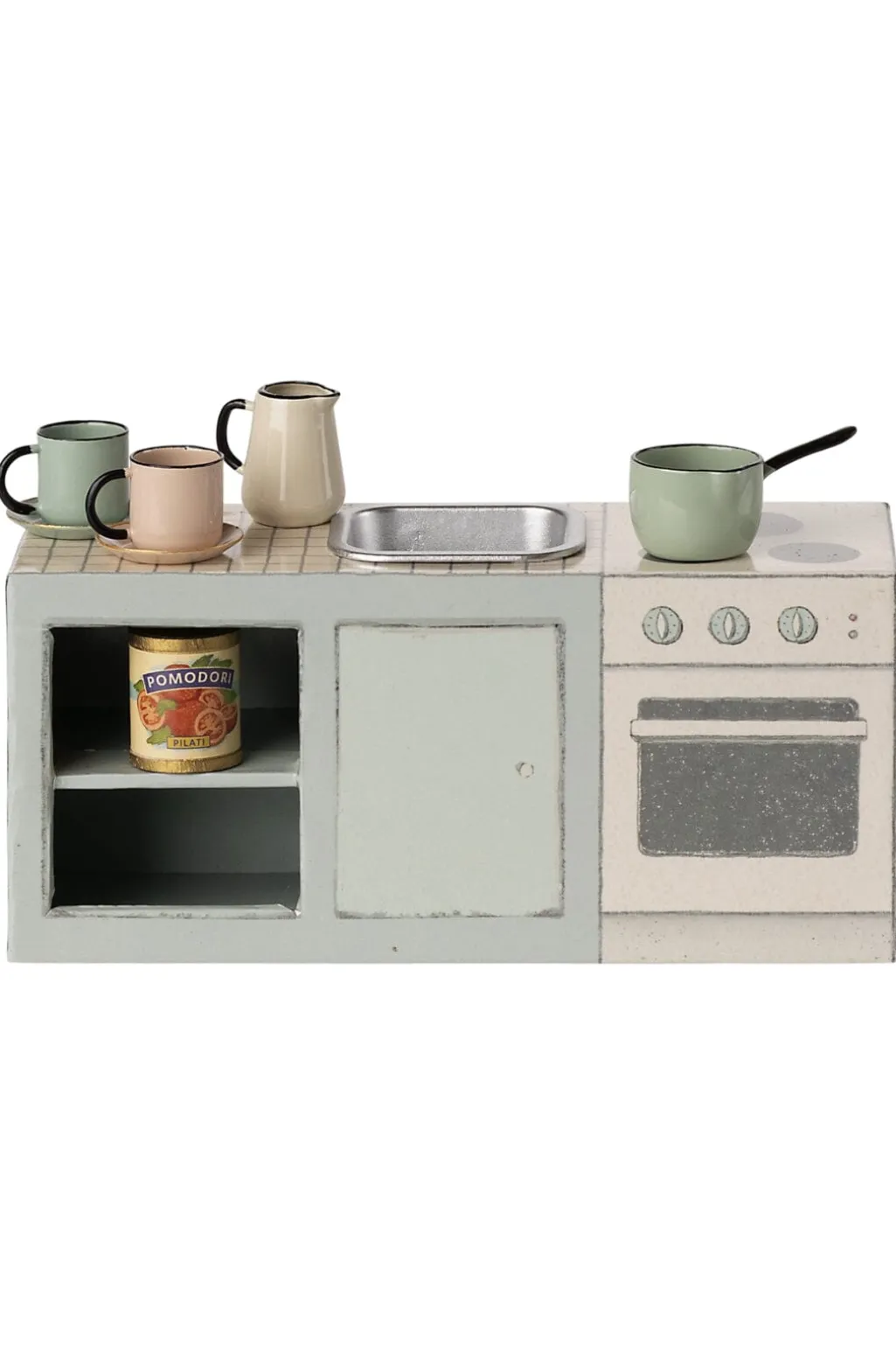 Et køkkenbord fra Maileg, designet til mus. Bordet har en indbygget vask og komfur med tre knapper samt hylder til køkkenredskaber.