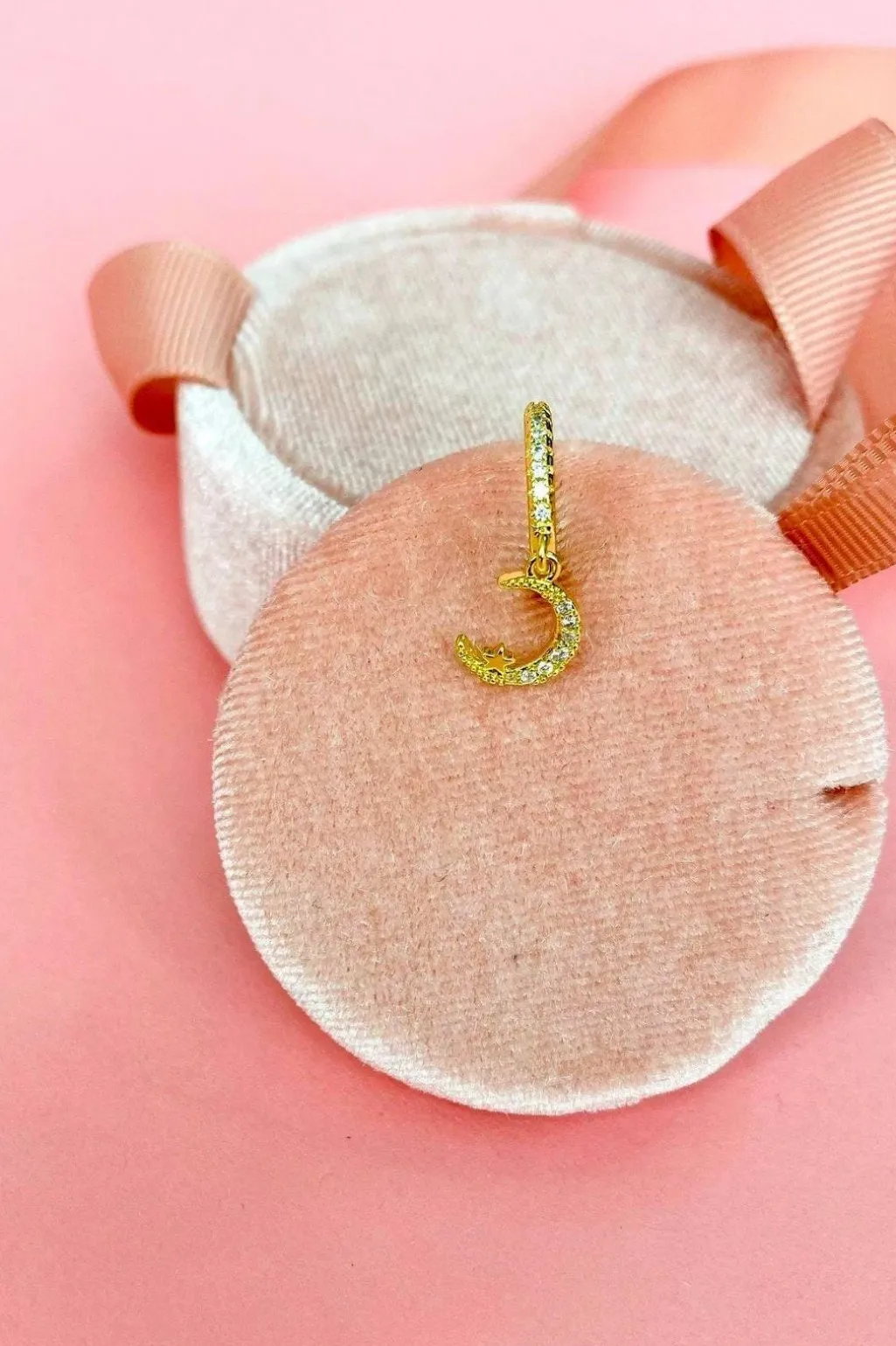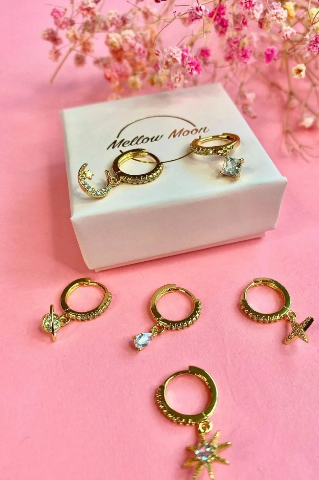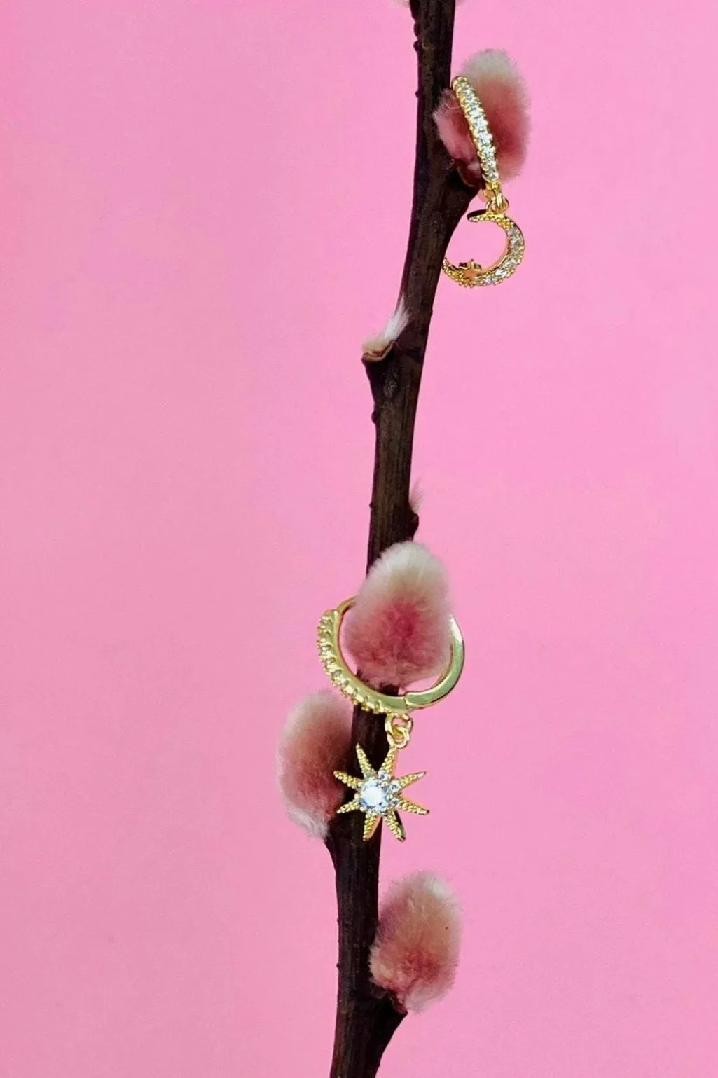 Kreol-øreringe fra Mellow Moon med måneformet vedhæng. De er lavet af forgyldt messing uden nikkel og bly, hvilket gør dem hudvenlige at bære.