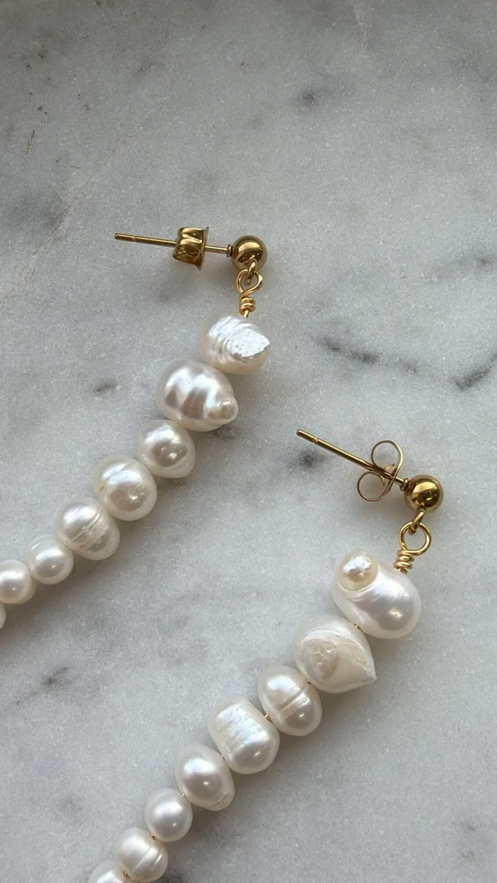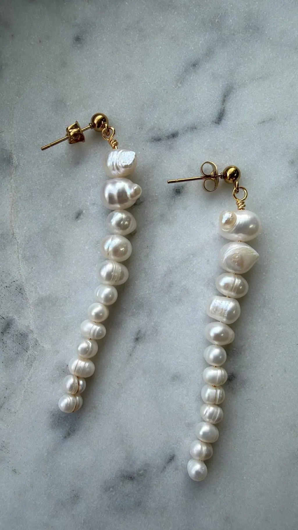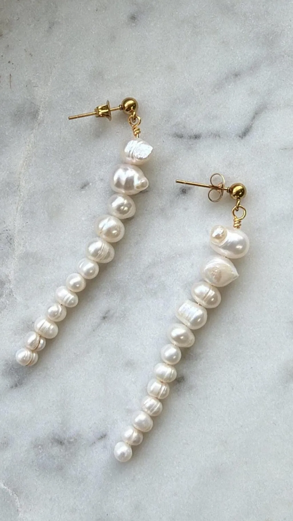 Øreringe fra Molly&My Jewellery med ferskvandsperler og forgyldt finish. De hvide perler hænger i en lang række ned fra en guldfarvet hook-mekanisme.